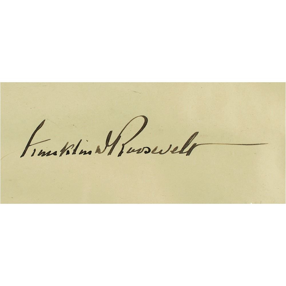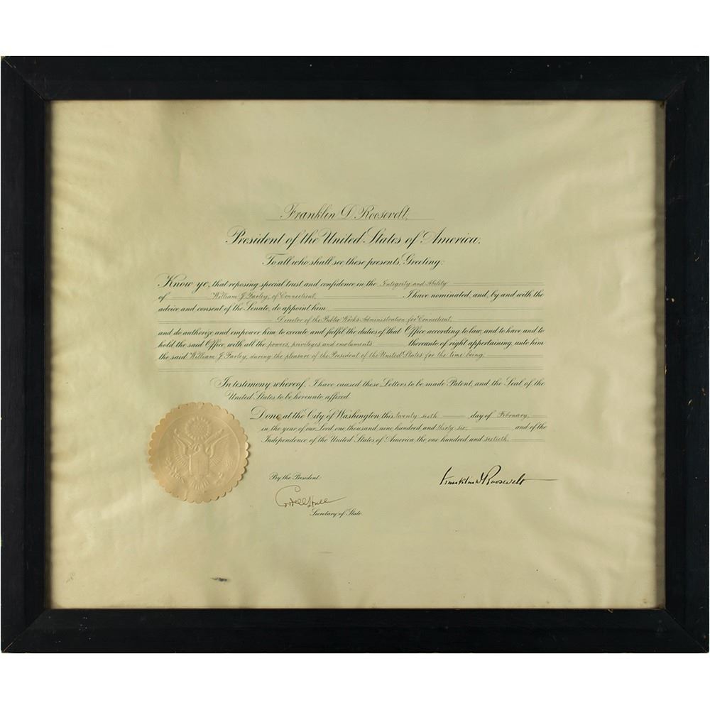 Large partly-printed DS as president, one page, 22.5 x 18.5, February 26, 1936. President Roosevelt appoints William J. Farley, of Connecticut as "Director of the Public Works, Administration for Connecticut." Signed neatly at the conclusion by Franklin D. Roosevelt, and countersigned by Secretary of State Cordell Hull. The beige paper seal remains affixed to the lower left. Framed to a slightly larger size. In very good to fine condition, with rippling to the edges.