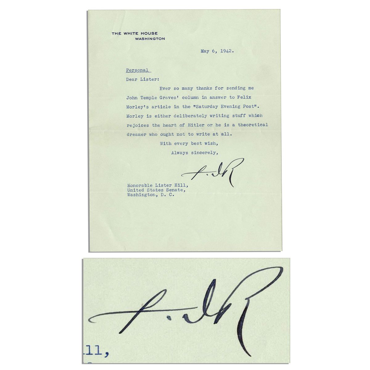 Franklin D. Roosevelt WWII typed letter signed as President. Dated 6 May, 1942, letter on White House stationery is labeled ''Personal'' in type. Addressed to the Honorable Lester Hill of the United States Senate, letter reads in full, ''Dear Lister: Ever so many thanks for sending me John Temple Graves' column in answer to Felix Morley's article in the 'Saturday Evening Post'. Morley is either deliberately writing stuff which rejoices the heart of Hitler or he is a theoretical dreamer who ought not to write at all. With every best wish, Always sincerely, [signed] F.D.R.'' Accompanied by White House envelope and the magazine containing the article in question. Single-page letter on card style stationery measures 7'' x 8.75''. Creasing, else fine.