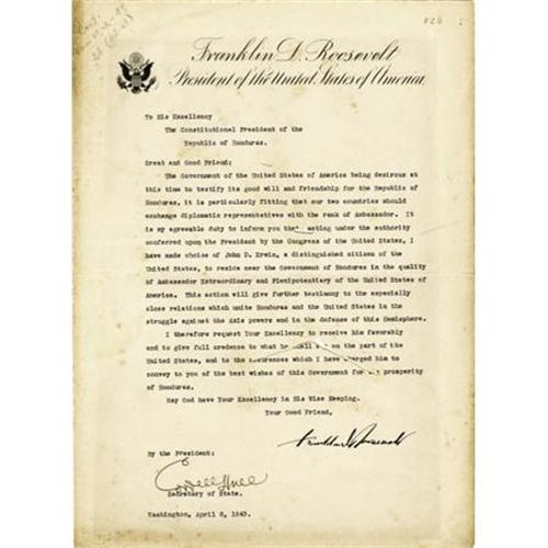<B>Franklin D. Roosevelt Typed Letter of State Signed</B></I> "<I>Franklin D. Roosevelt</B></I>" as President and "<I>Cordell Hull</B></I>" as Secretary of State, one page, 10" x 13.75". Washington, April 6, 1943. "<I>To His Excellency/The Constitutional President of the/Republic of Honduras</B></I>" Tiburcio Carias Andino who had become the Honduran leader in 1933, a month before FDR's inauguration. Roosevelt writes to his "<I>Great and Good Friend</B></I>" that the United States "<I>being desirous at this time to testify its good will and friendship for the Republic of Honduras, it is particularly fitting that our two countries should exchange diplomatic representatives with the rank of Ambassador...</B></I>" John Slidell of Louisiana had been commissioned as Minister to Central America in 1853; he declined. It wasn't until this appointment, 30 Ministers and 90 years later, that the United States elevated its diplomatic representation in Honduras from Envoy Extraordinary and Minister Plenipotentiary to Ambassador Extraordinary and Plenipotentiary. John D. Erwin, appointed Minister to Honduras by FDR in 1937, was promoted to Ambassador. FDR notes that "<I>this action will give further testimony to the especially close relations which unite Honduras and the United States in the struggle against the Axis powers and in the defense of this Hemisphere</B></I>." World War II references are rarely found in FDR's letters of state. It's interesting to note that Erwin's annual minister's salary of $10,000 was not raised to the $17,500 ambassador's salary upon his promotion. The letter is worm-eaten in three areas, not near signatures, not materially affecting the text. Gilt-edged paper, lightly foxed. Light rectangular shading at perimeter from prior framing. Dark signature of President Roosevelt. Overall, fine condition. With an engraved portrait of FDR.<BR><BR><b>Shipping:</b> Flat Material, Small (<a target="_blank" href="http://www.heritageauctions.com/common/shipping.php">view shipping information</a>)