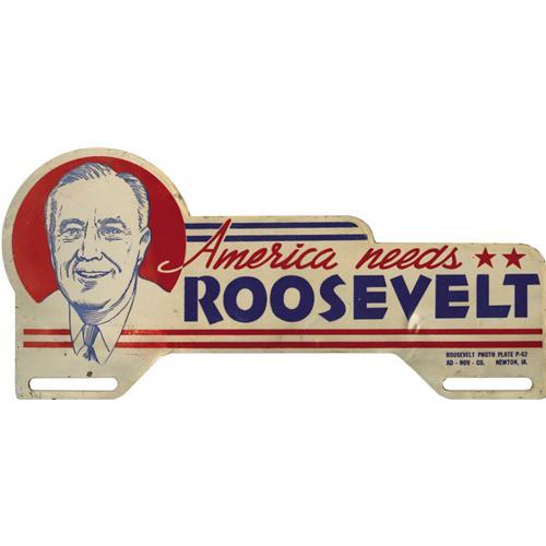 <B>Franklin D. Roosevelt License Plate Attachment,</B></I> 9.75" x 4.75", 1940. This exciting memento from FDR's third presidential bid reads "America needs Roosevelt" and carries a portrait of the aging statesman. The red, white, and blue graphics are evocative of the era and are similar to those on a Willkie plate by the same manufacturer. Minor soiling and light wear from use, else excellent condition.<BR><BR><b>Shipping:</b> Small Collectibles (<a target="_blank" href="http://www.heritageauctions.com/common/shipping.php">view shipping information</a>)