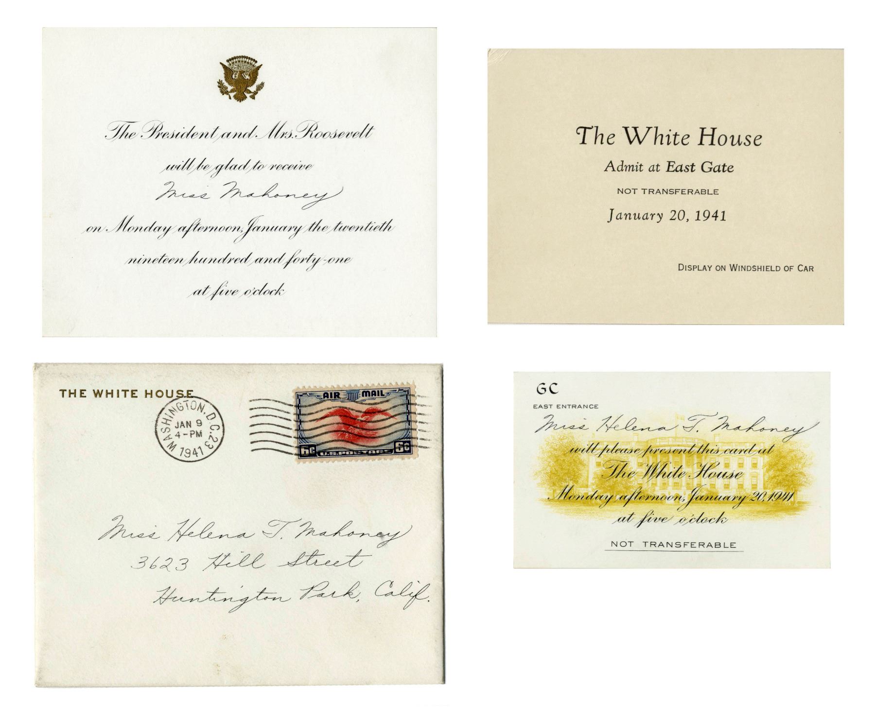 Franklin D. Roosevelt lot of inauguration items from his unprecedented third Presidential term on 20 January 1941, all sent to FDR's personal physical therapist Helena Mahoney. Lot includes: (1) Invitation with gilt Presidential seal at top, measuring 5'' x 4''; (2) White House admittance ticket for East Gate entrance, to be displayed on the car windshield, measuring 4.5'' x 3.5''; (3) White House entrance ticket, measuring 4'' x 2.5''; (4) White House envelope to Mahoney, postmarked 9 January 1941. All items are in very good plus condition.