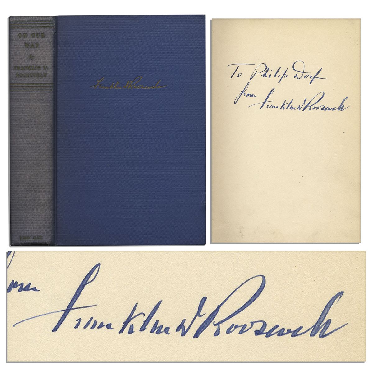 Signed first edition of Franklin D. Roosevelt's book ''On Our Way'', published by The John Day Company: New York: 1934. Roosevelt's bold blue autograph inscription to the front free endpaper reads ''To Philip Dorf / from / Franklin D Roosevelt''. FDR's account of his first year in office is a first issue, complete with the number 1 on the copyright page, the word ''party'' instead of ''property'' on page x and the word ''willing'' rather than ''unwilling'' on page 162. Runs 300pp. Bound in blue cloth boards with gilt lettering and top edge red. Measures 5.5'' x 7.75''. Dustjacket is absent. Sunning to spine and wear to corners, else near fine.