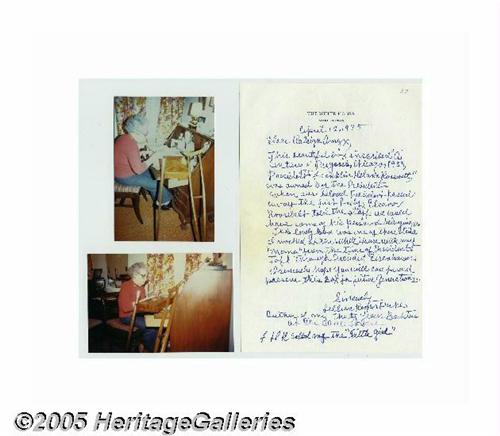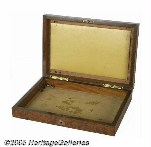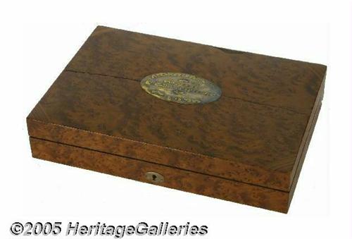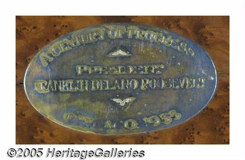 <B>Franklin D. Roosevelt Owned Century of Progress Wooden Presentation Box</B></I> Early in FDR's administration he paid a visit to the 1933 Chicago Century of Progress World's Fair. Approximately 7 1/2" x 11 1/4", this wooden box has a silver plate on top inscribed with the fair and the President's name. At the time of his death, First Lady Eleanor Roosevelt gave a number of personal items to the White House staff. Maid Lillian Rogers Parks selected this great presentation piece to take home. A long historical handwritten letter describes the circumstances of this elegant and historic FDR possession. Lot:254