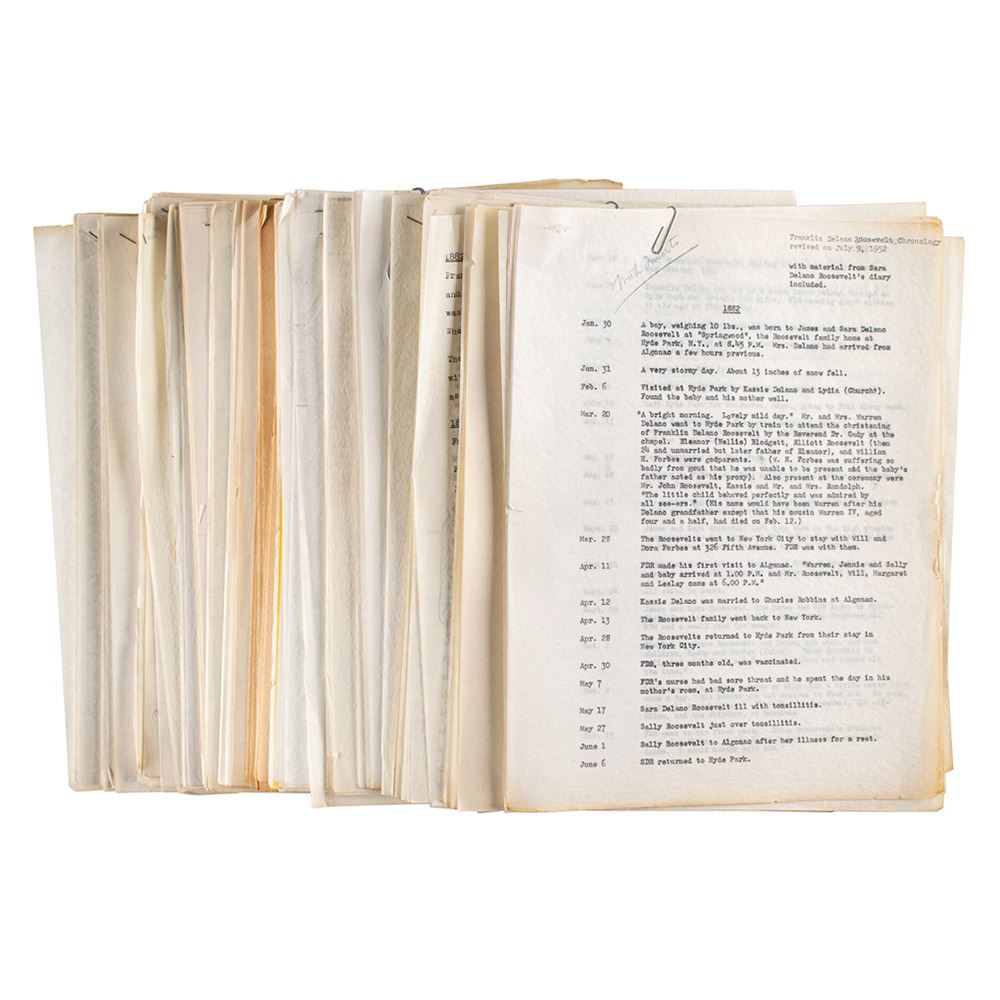 Typed biographical chronology of Franklin D. Roosevelt's life, totaling more than 425 pages, from the papers of documentary filmmaker Pare Lorentz. The timeline traces FDR's life from his birth in 1882 through his death in 1945, offering detailed—often day-by-day—insight into his childhood and upbringing, early life, career in politics, and presidential administration. Minor handwritten corrections and additions have been made throughout in an unknown hand, likely that of Lorentz. In overall fine condition.