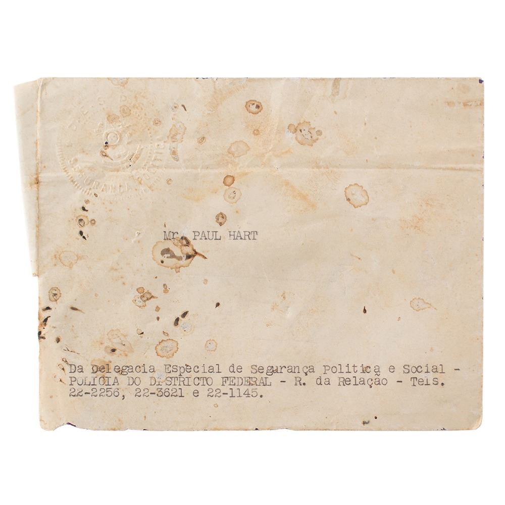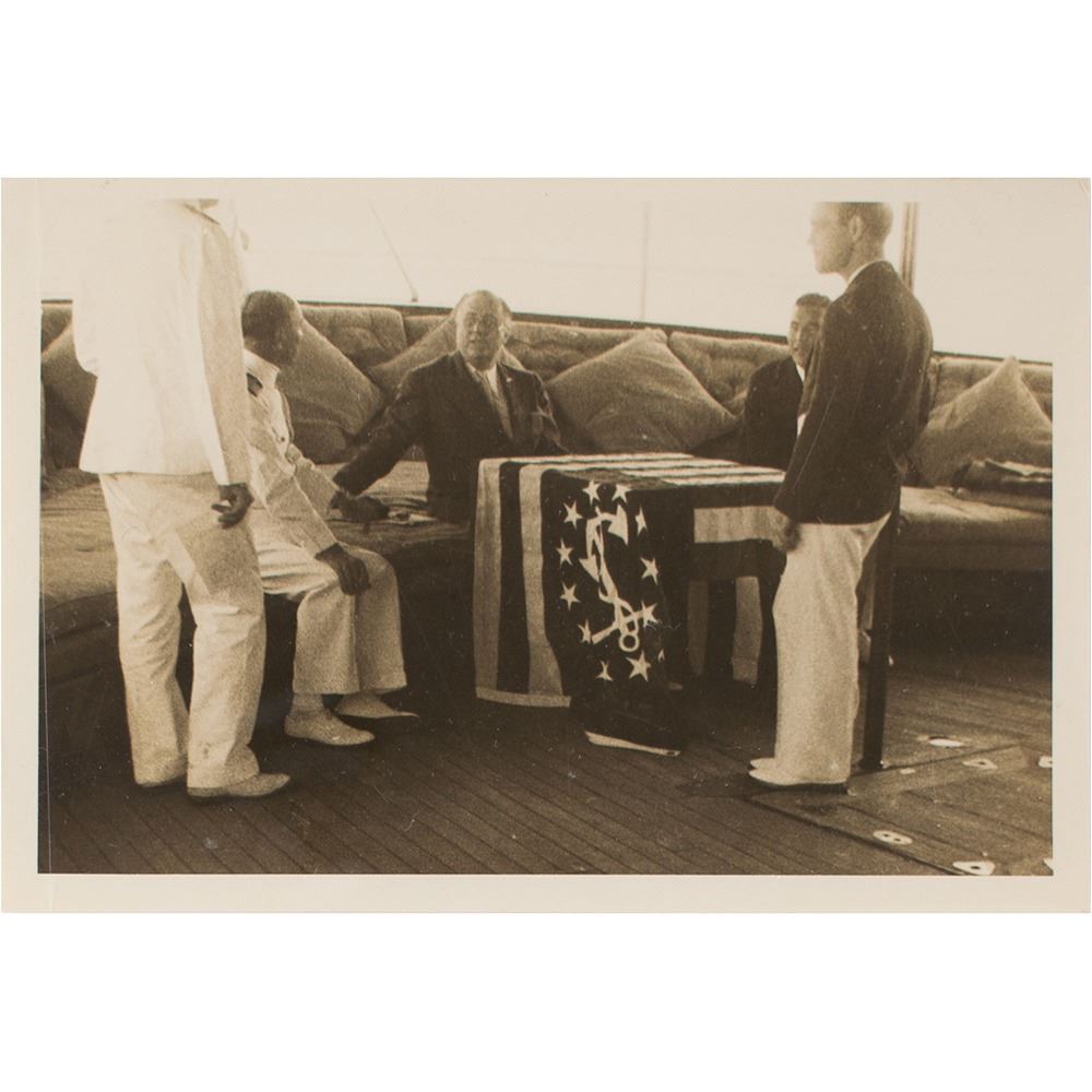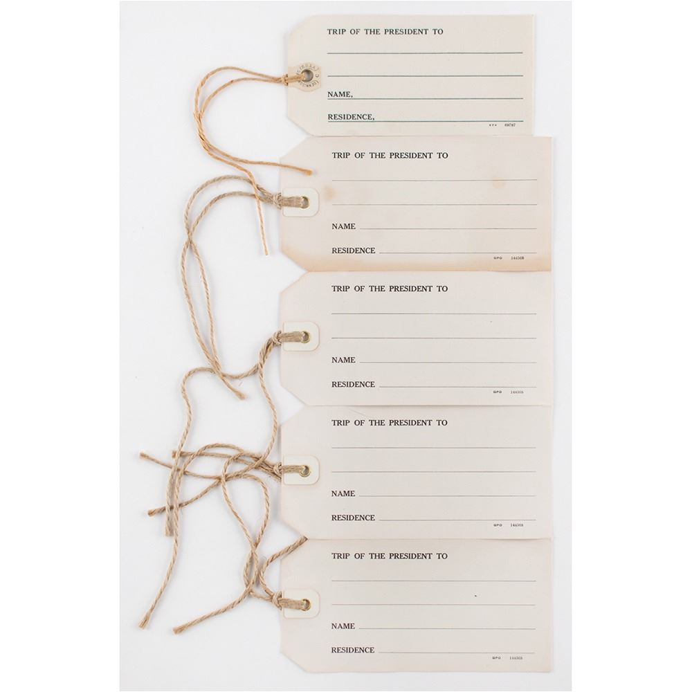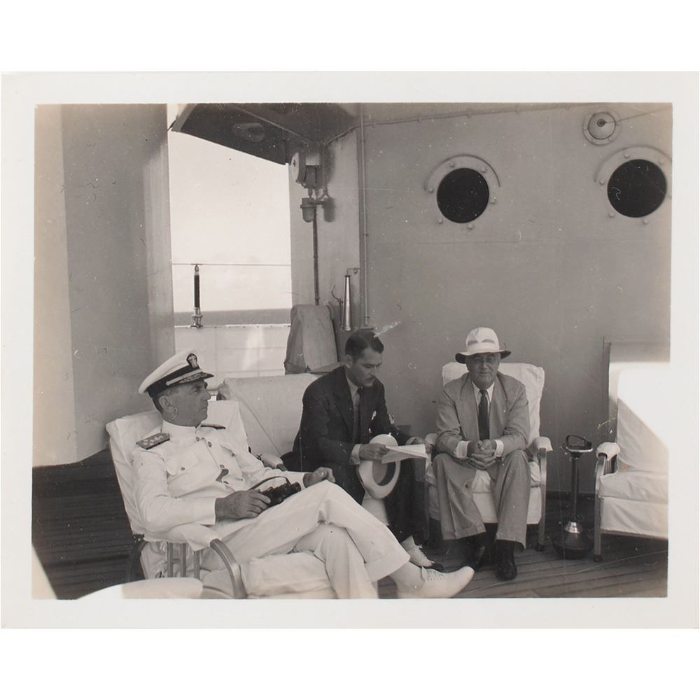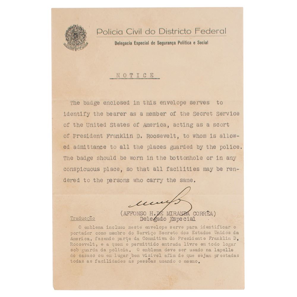 Rare pair of badges from the collection of Secret Service agent Paul M. Hart, who worked as part of Franklin D. Roosevelt's detail during his 1936 cruise to South America; the voyage culminated in the Inter-American Conference for the Maintenance of Peace held at Buenos Aires, Argentina. Includes one badge with a golden Argentine 'Sol de Mayo' emblem backed by a light blue-and-white rosette ribbon, 2.25è in diameter; and one featuring Brazil's coat of arms with red-and-white ribbon below, measuring 3è long, with a letter on "Policia Civil do Districto Federal" letterhead, in full (spelling retained): "Notice: The badge enclosed in this envelope serves to identify the bearer as a member of the Secret Service of the United States of Ameria, acting as a scort of President Franklin D. Roosevelt, to whom is allowed admittance to all the places guarded by the police. The badge should be worn in the bottonhole or in any conspicuous place, so that all facilities may be rendered to the persons who carry the same." Also includes two original glossy candid photographs of FDR on board the USS Indianapolis and five blank "Trip of the President" luggage tags. In overall fine condition.