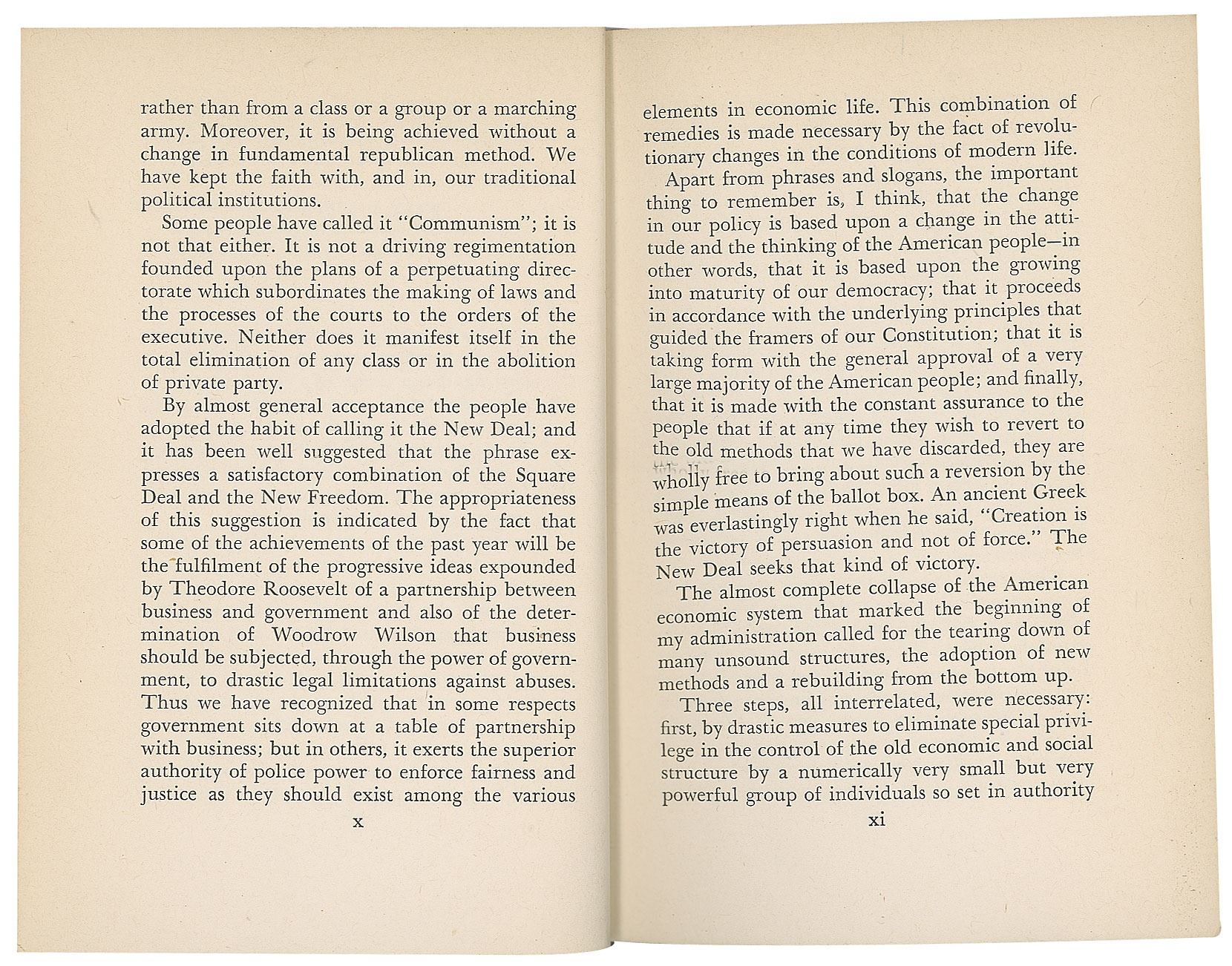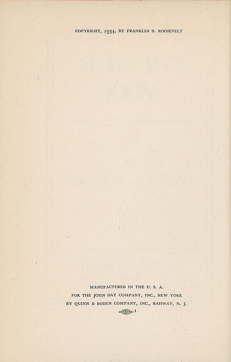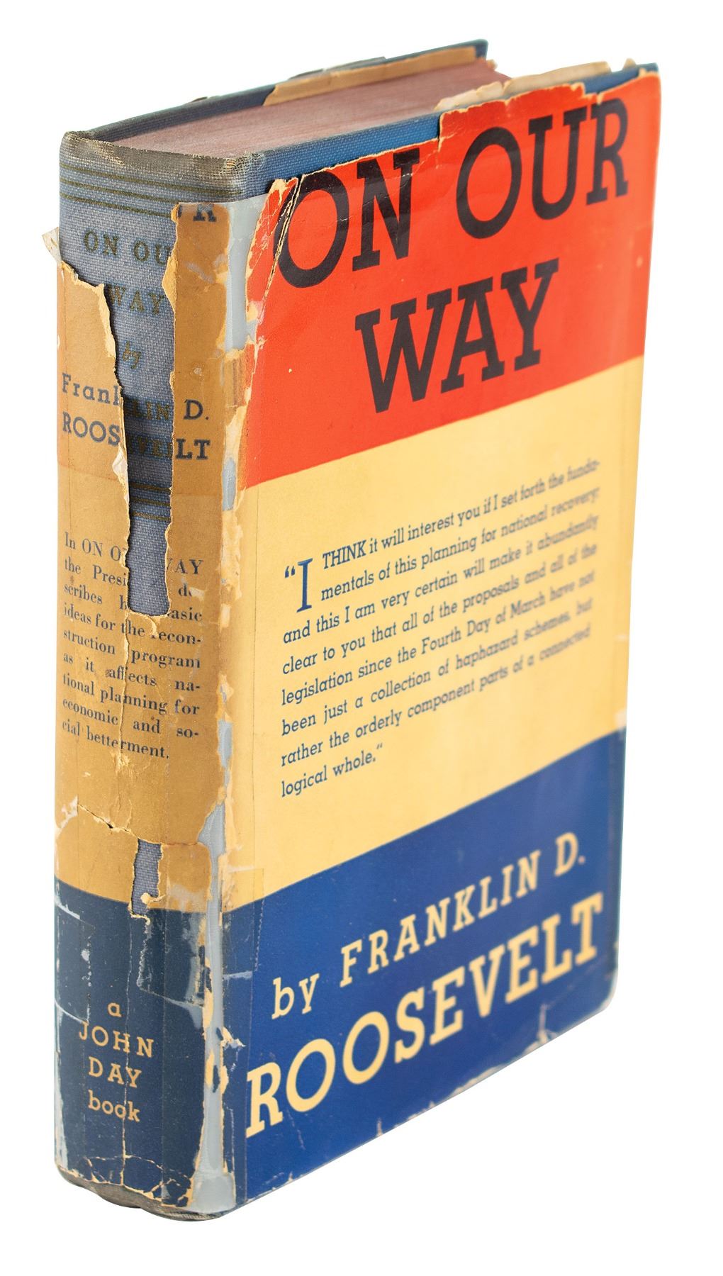Signed book: On Our Way. First edition, first state (with "private party" on page x, "willing" on page 162, and "Erratum" slip laid in for page x). NY: The John Day Company, 1934. Hardcover bound in blue cloth, with dust jacket, 5.5 x 7.75, 300 pages. Signed and inscribed on the first free end page in fountain pen, "For Sam J. Wolf, from his friend, Franklin D. Roosevelt." Autographic condition: fine. Book condition: VG/G, with irregular sunning to cloth spine, significant tears and losses to dust jacket (especially to the crudely tape-repaired spine), and a "Library of Lawrence E. Miller" blindstamp to a rear page. Samuel Johnson Wolf was a successful artist who created portraits of popular figures, including Franklin D. Roosevelt.