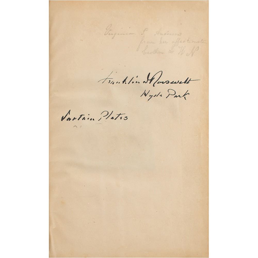 Signed book: The Dew Drop: A Tribute of Affection for MDCCCLIII. Philadelphia: Lippincott, Grambo & Co., 1853. Hardcover, 5.25 x 7.5, 328 pages. Signed on the first free end page in ink with his ownership signature, "Franklin D. Roosevelt, Hyde Park," adding, "Sartain Plates," to identify the illustrator/engraver, John Sartain. In fine condition, with some light soiling to the signed page. Book condition: VG-/None, with losses and rubbing to spine, scuffing and rubbing to boards, and an unrelated presentation inscription above FDR's signature.