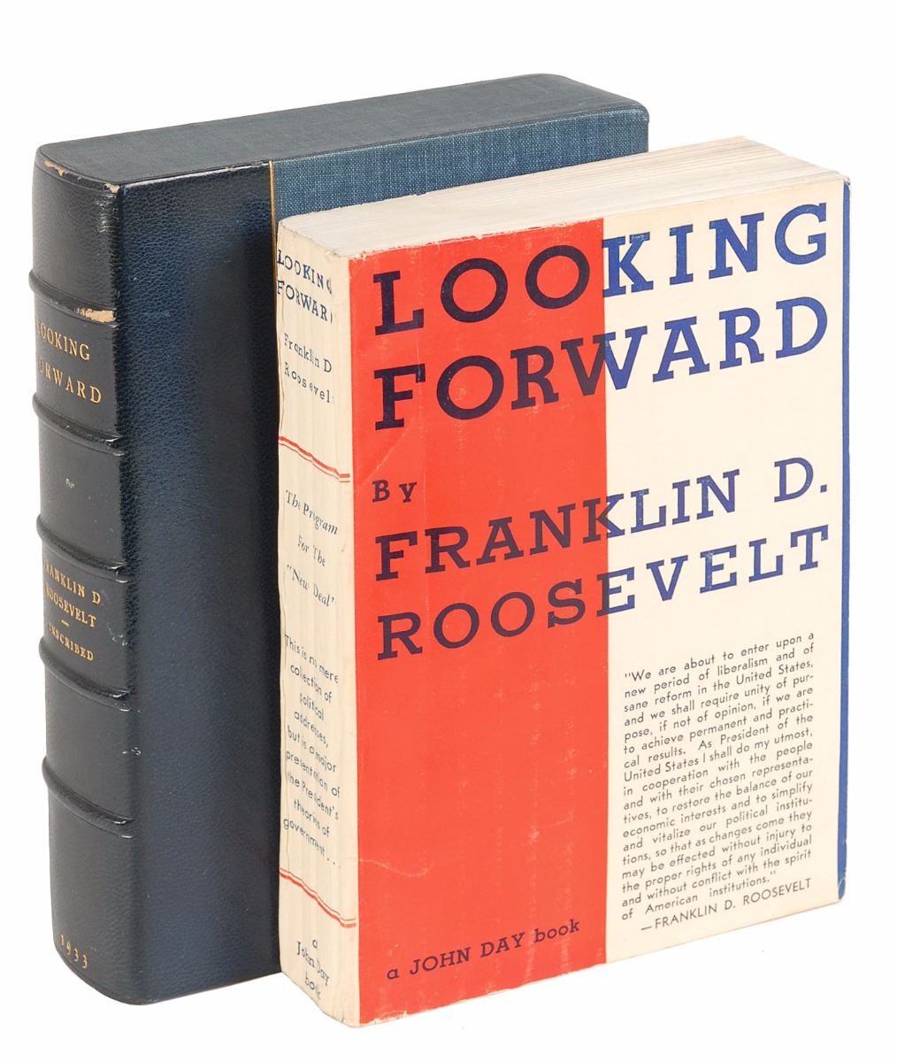Signed book: Looking Forward. First edition, first printing. NY: John Day Company, 1933. Softcover, 5 x 7.5, 279 pages. Signed and inscribed on the first free end page, “Dear Fred—This advanced copy was changed to correct inaccuracies etc. And I am glad that the public did not see this original. Affectionately, Franklin D. Roosevelt, Fred B. Adams, Jr., Hyde Park & Rhinebeck, June 24, 1934.” Housed in a custom-made chemise and morocco-backed slipcase. A repaired tear and some wrinkling to front cover, light erased pencil notations at top of signed page, toning to covers and creasing to spine, as well as some scattered edge wear, otherwise fine condition. Accompanied by two letters from the White House assistant secretary concerning the publication and a related article.