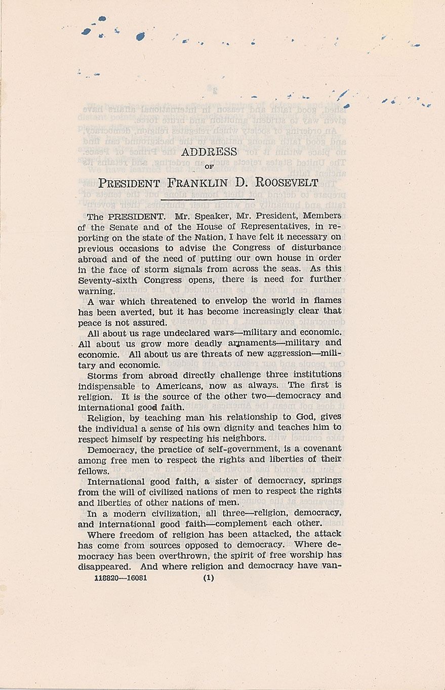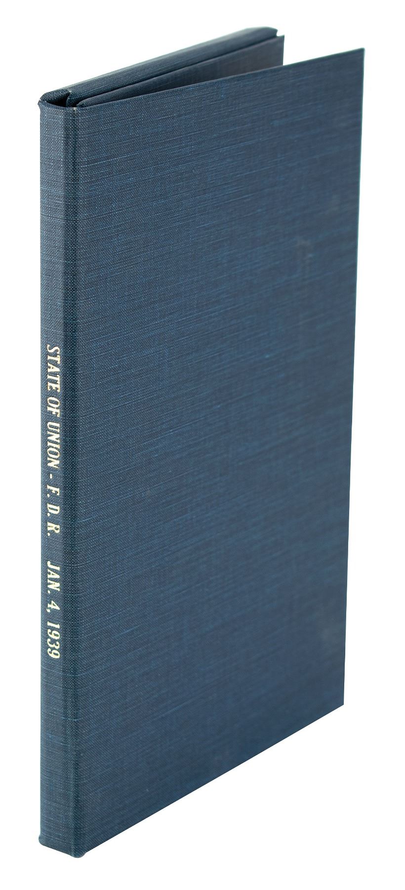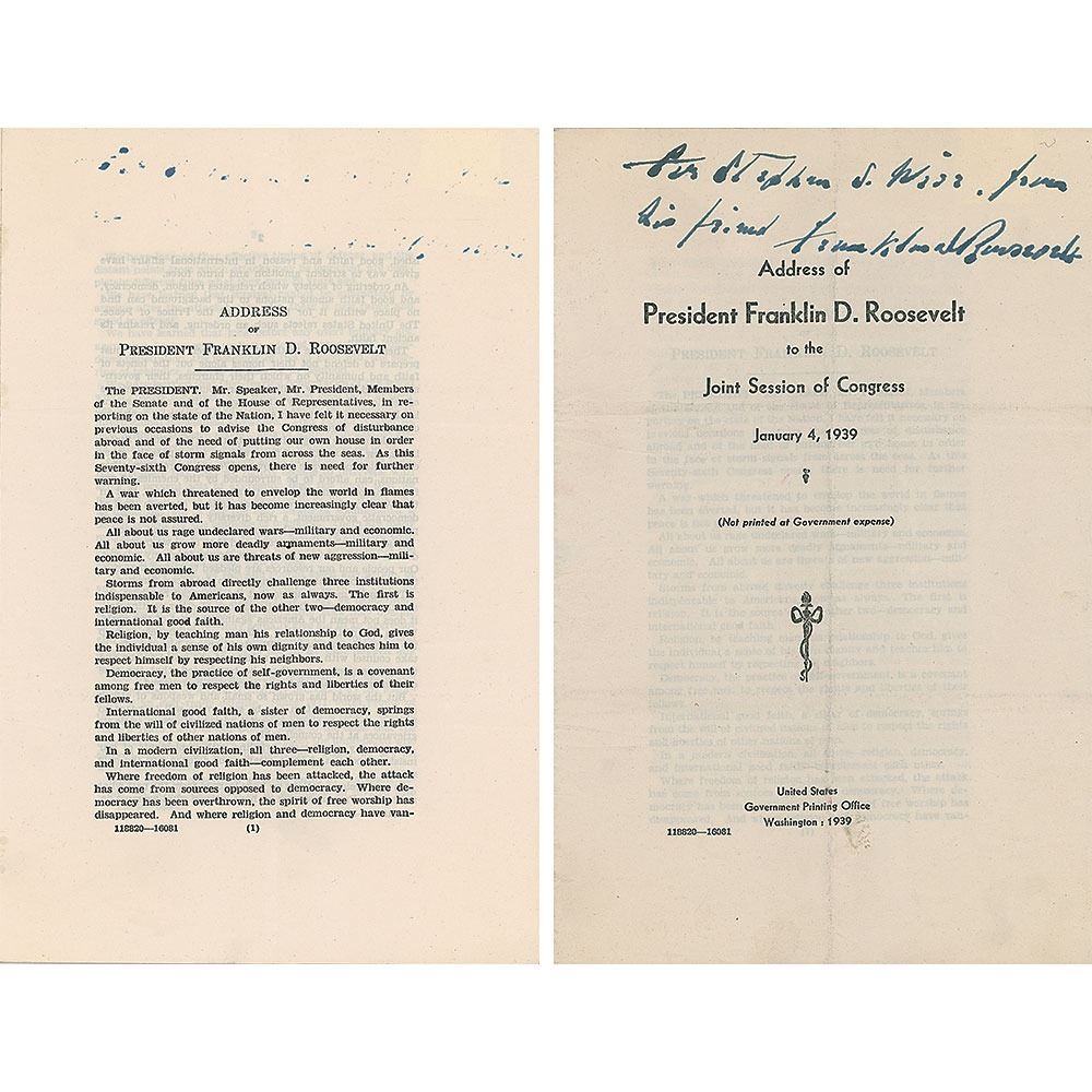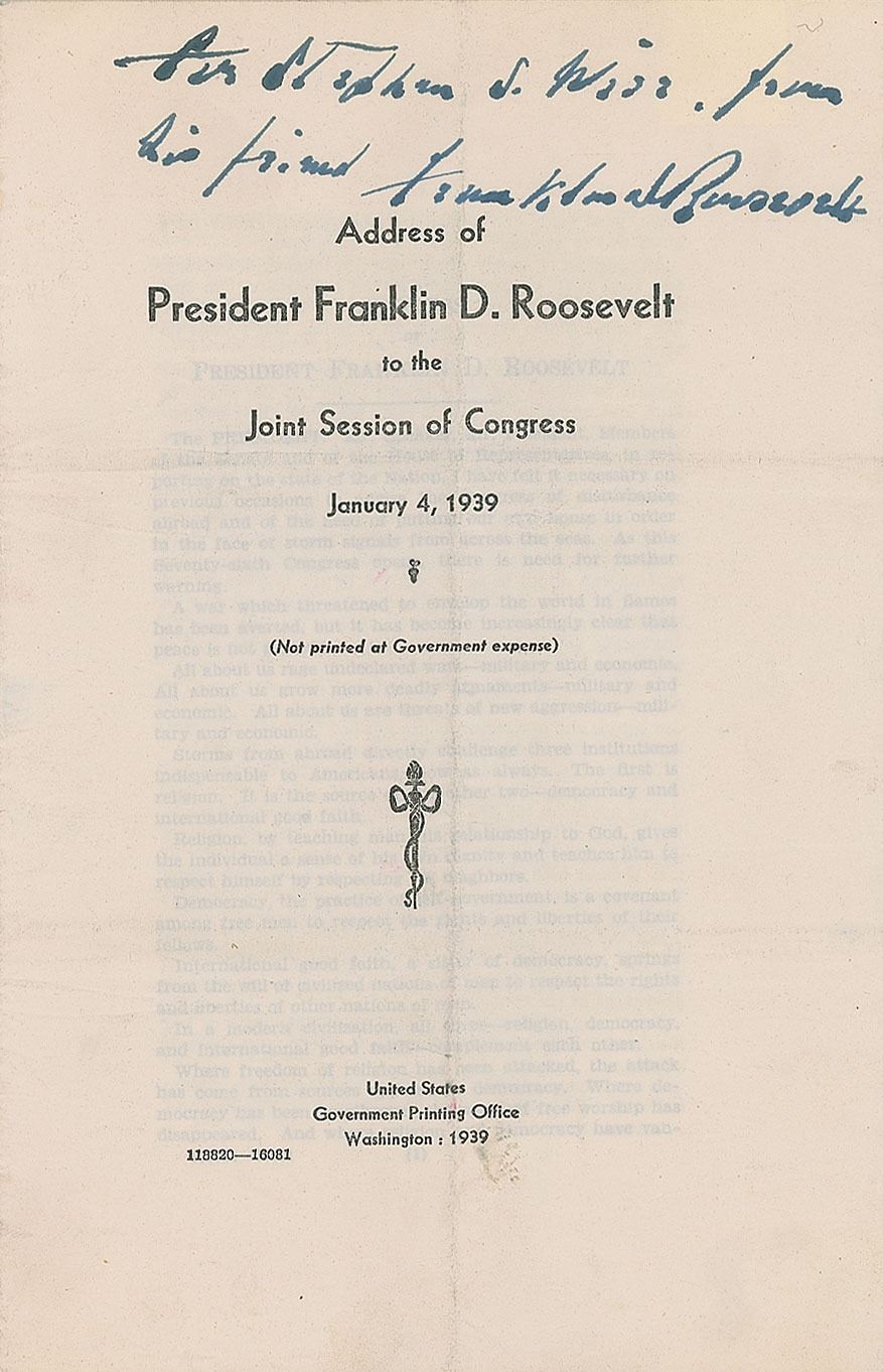 Official booklet entitled "Address of President Franklin D. Roosevelt to the Joint Session of Congress, January 4, 1939," published by the Government Printing Office, 5.75 x 9, ten pages, signed and inscribed on the front cover in fountain pen to the well-known progressive rabbi Stephen Samuel Wise, "For Stephen S. Wise, from his friend, Franklin D. Roosevelt." In very good to fine condition, with intersecting folds, some curling at corners, and a "Library of Lawrence E. Miller" blindstamp to the last page. Accompanied by a custom-made presentation folder with gilt spine titling.