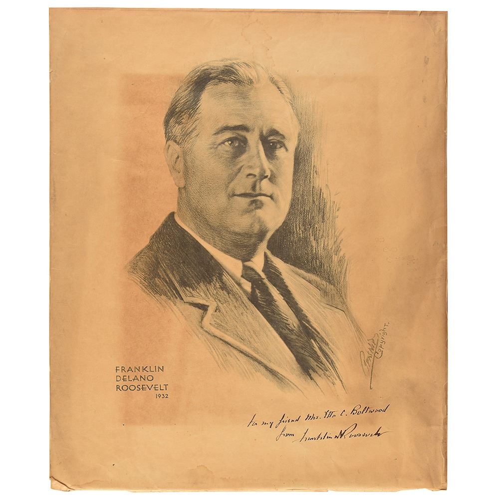 Impressive oversized 14.25 x 17.25 engraving of Franklin D. Roosevelt from 1932, boldly signed and inscribed in fountain pen, "For my friend Mrs. Etta C. Boltwood, from Franklin D. Roosevelt." In very good condition, with toning, soiling, creasing, and staining to both the bottom edge as well as another area at the top which touches FDR's hair.