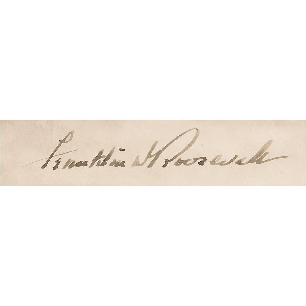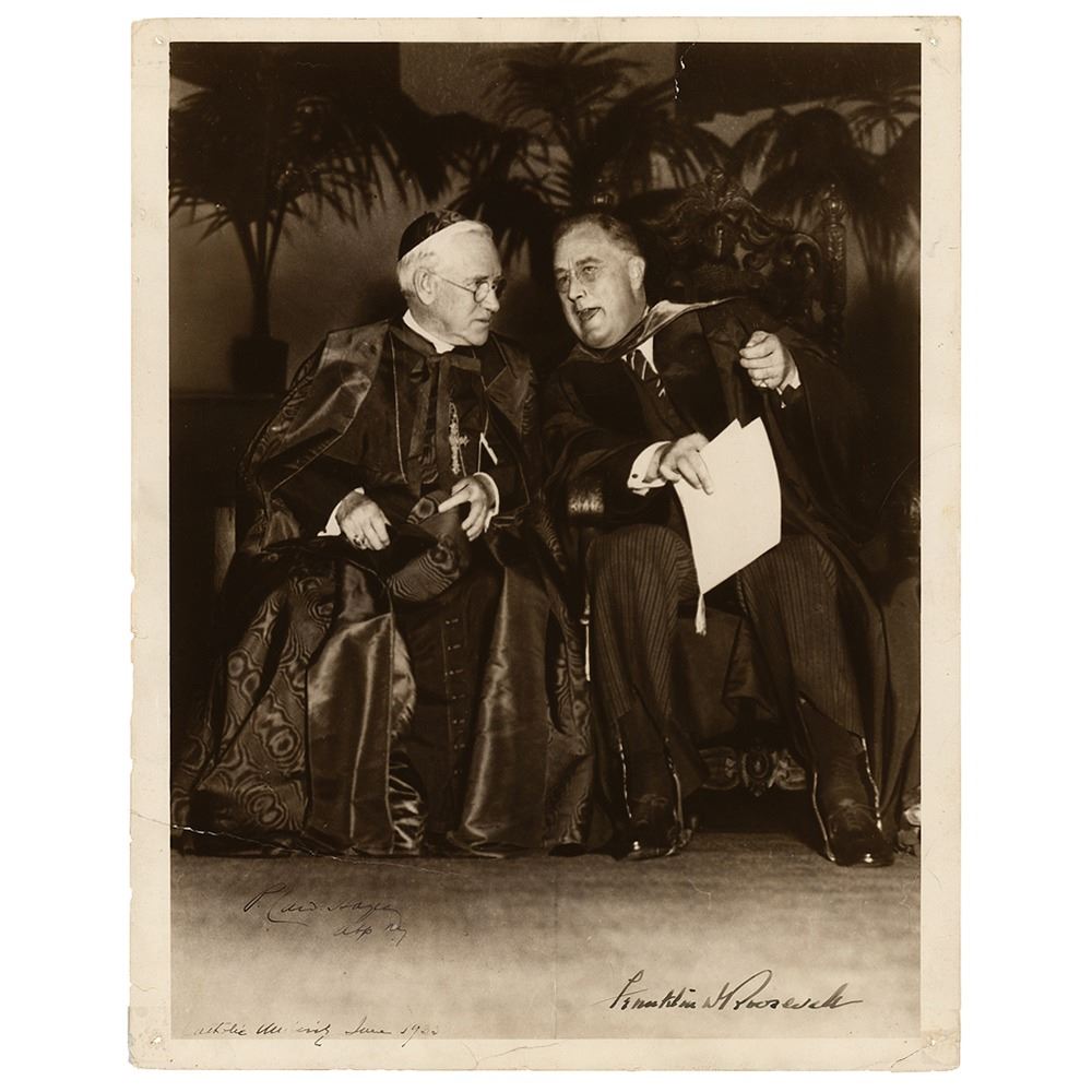 Oversized vintage matte-finish 11 x 15 photo of President Franklin D. Roosevelt seated and talking with Patrick Cardinal Hayes, the Archbishop of New York, at Catholic University on June 13, 1933, signed nicely in fountain pen as president, “Franklin D. Roosevelt.†The photo is also signed by Hayes, who adds the date and location below. In very good to fine condition, with scattered creasing, tack holes to the corners, and a tear to the top edge. So as not to draw attention to Roosevelt’s polio and subsequent disability, great care was taken to prevent any photos from being taken of the president wearing his braces or in his wheelchair. Photos depicting as much remain very rare, with signed examples virtually nonexistent.