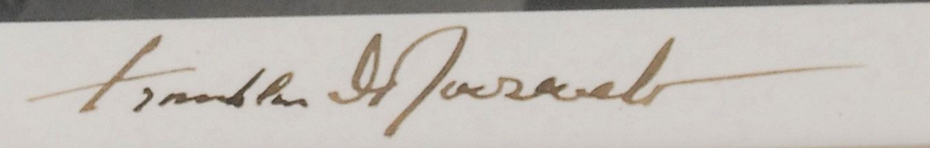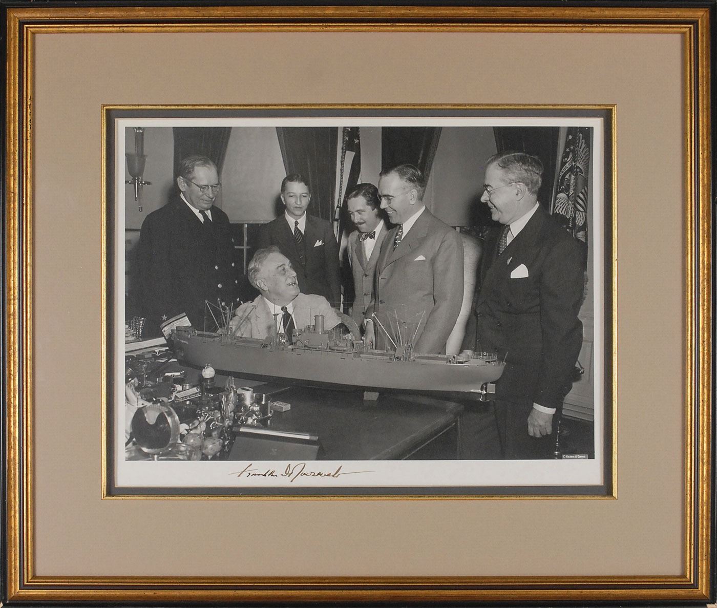 Superlative vintage matte-finish 14.5 x 11 photo of Roosevelt accepting a six-foot model of the Liberty ship SS John Bidwell, beautifully signed as president in the lower border in fountain pen. The photo, originally taken by Harris and Ewing on January 4, 1943, shows a number of men surrounding Roosevelt: Admiral Howard L. Vickery of the Maritime Commission; Jack Adams, a Calship representative; Graham Spickard, Washington representative of the Bechtel-McCone shipyard; and John A. McCone, Calship's executive vice-president. Attractively double-matted and framed to an overall size of 21.5 x 18. In fine condition. Roosevelt had enacted the Emergency Shipbuilding program in late 1940, under which the military contracted with Bechtel-McCone for ship production. Under control of Bechtel-McCone, the California Shipbuilding Company (Calship) constructed 467 ships throughout World War II. When Calship set a new production record of 16 ships in one month, they presented FDR with this model of the SS John Bidwell to commemorate the feat.