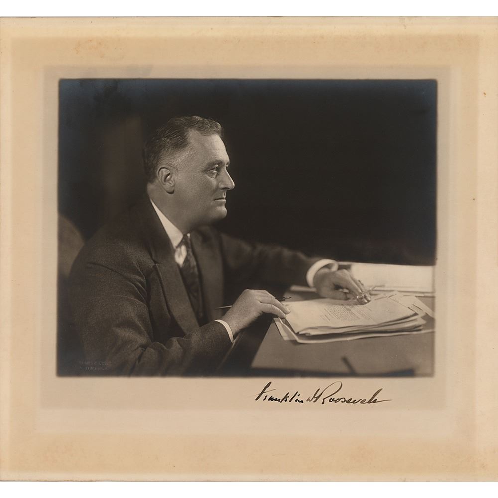 Superior vintage matte-finish 11.75 x 11 Harris & Ewing photo of Franklin D. Roosevelt seated at his desk, signed in the lower border in fountain pen, "Franklin D. Roosevelt." In fine condition, with trimmed borders, and toning from prior display.