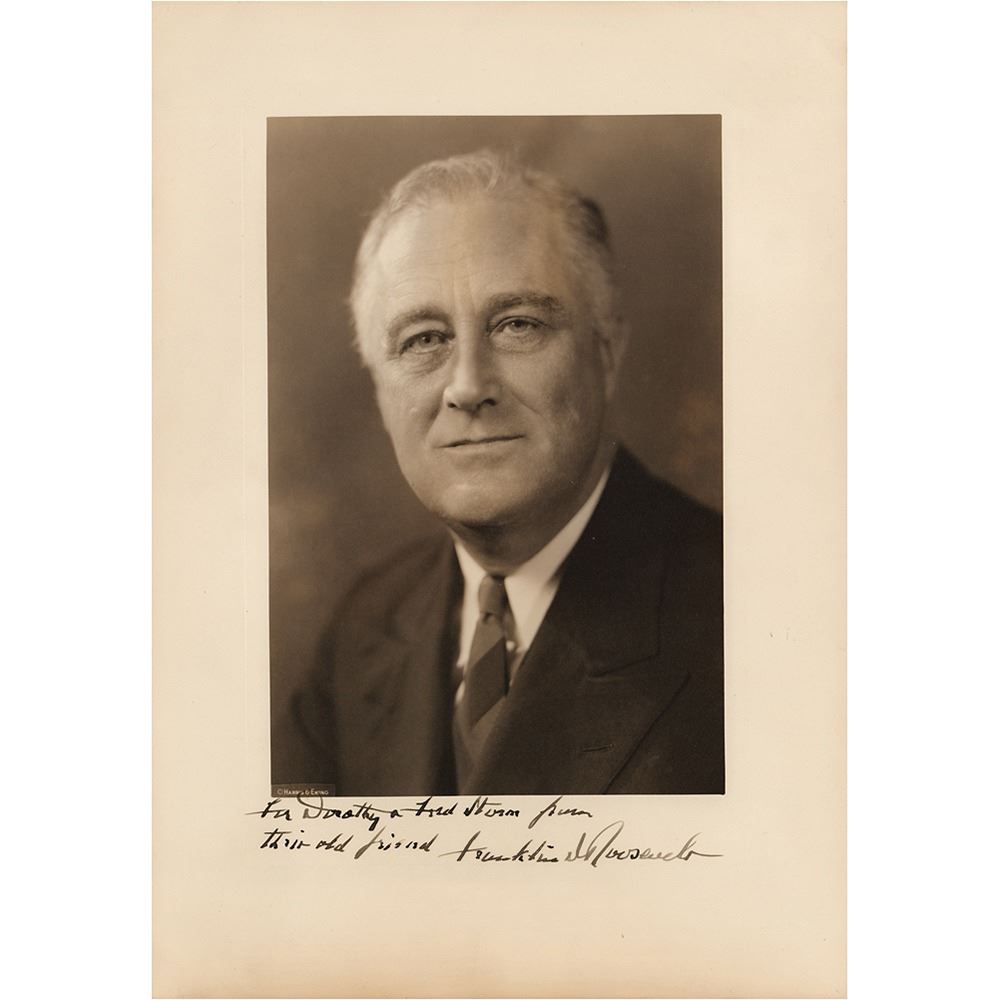 Choice vintage matte-finish 9.25 x 13.25 photo of Roosevelt by Harris & Ewing, signed and inscribed in the lower border in fountain pen, "For Dorothy & Fred Storm, from their old friend Franklin D. Roosevelt." In very fine condition. A handsome oversized portrait of Roosevelt, boldly inscribed to his old friends.