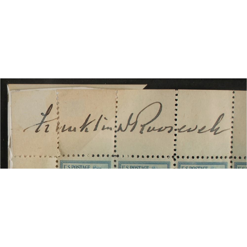Highly desirable sheet of 100 five-cent postage stamps honoring Revolutionary War hero Tadeusz Kosciuszko issued in 1933, signed in the upper margin in fountain pen by Franklin D. Roosevelt. Corner-mounted, matted, and framed with a portrait and slip attributing the stamps to FDR's personal collection to an overall size of 24 x 17.5. In fine condition. FDR was known far and wide as an avid stamp collector, making this an excellent format for his autograph.