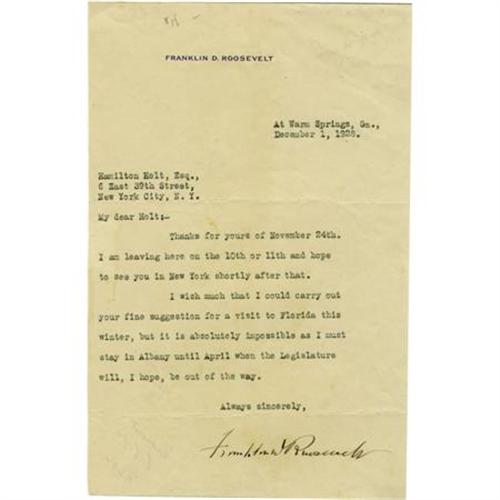 <B>Franklin D. Roosevelt Typed Letter Signed as Governor of New York</B></I> “<I>Franklin D. Roosevelt</B></I>”. One page, 5.25” x 8”, on Roosevelt's personal letterhead, Warm Springs, Georgia, December 1, 1928, to Hamilton Holt, New York. Roosevelt writes to educator and author, Hamilton Holt. A friendly, informal letter in which Roosevelt thanks Holt for suggesting Florida as winter vacation spot but regrets that legislative business will keep him busy until April. Fine condition. <I>From the collection of Henry E. Luhrs.</B></I><BR><BR><b>Shipping:</b> Flat Material, Small (<a target="_blank" href="http://www.heritageauctions.com/common/shipping.php">view shipping information</a>)