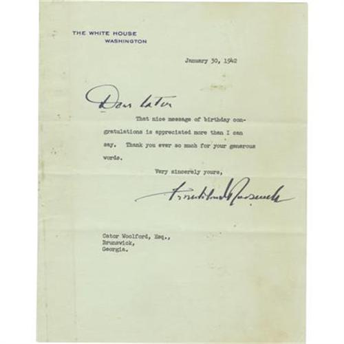 <B>Franklin D. Roosevelt Typed Letter Signed in Full as President</B></I> "<I>Franklin D. Roosevelt</B></I>". One page, 7" x 8.75", on White House letterhead, Washington, January 30, 1942 to Cator Woolford, Brunswick, Georgia. In this letter the president thanks Woolford for his birthday congratulations. The letter has been "married" to a White House envelope with a 1933 post date. The letter has the usual fold creases with an old taped reinforcement on the verso, else a fine, bold and bright signature.<BR><BR><BR><b>Shipping:</b> Flat Material, Small (<a target="_blank" href="http://www.heritageauctions.com/common/shipping.php">view shipping information</a>)