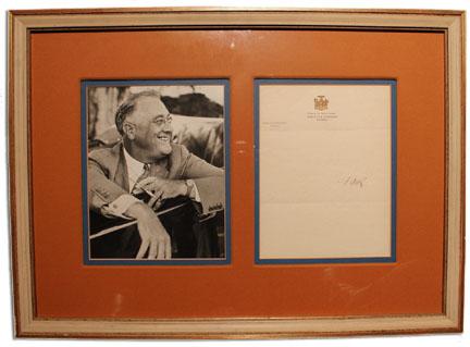 Franklin D. Roosevelt typed letter signed ''FDR'' as Governor of New York, dated 6 January 1931 on ''State of New York Executive Chamber Albany'' stationery. Letter is addressed to a doctor at the Warm Springs, Georgia polio rehabilitation resort that Roosevelt purchased after his paralysis and reads: ''Dear Doc: Here is a small contribution for Warm Springs.'' Type is very faint and almost unreadable, though FDR's initials are bold and pronounced. Letter measures 7'' x 9'', framed to an overall size of 24'' x 17.25''. Very good condition.