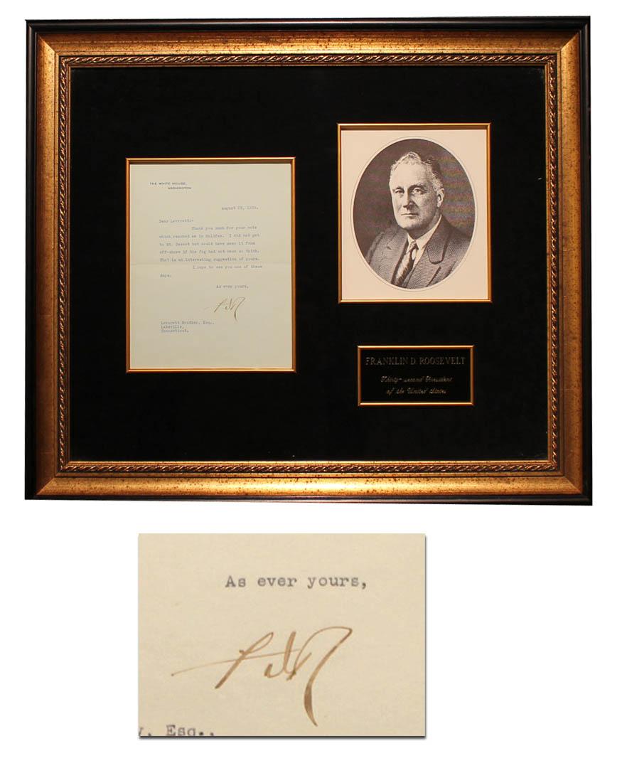Franklin D. Roosevelt typed letter signed as President, on official White House stationery. Letter, dated 25 August 1939, is addressed to Leverett Bradley and reads in part, ''Dear Leveretti:…Thank you so much for your note which reached me in Halifax…I hope to see you one of these days. As ever yours, F.D.R.'' Beautifully framed with black mat to a size of 24.5'' x 21''. Letter, measuring 7'' x 9'', is in fine condition. Also includes portrait engraving of the 32nd President.
