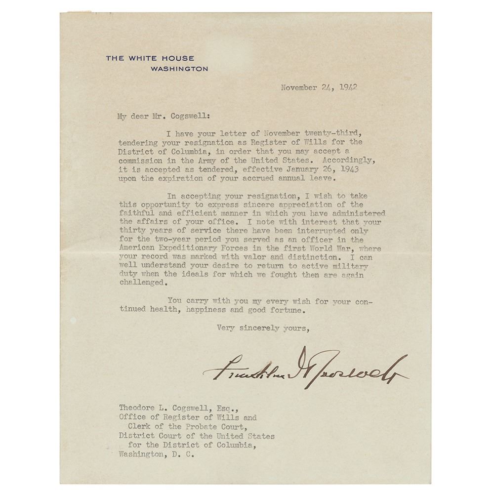World War II-dated TLS as president, one page, 7 x 8.75, White House letterhead, November 24, 1942. Letter to Theodore L. Cogswell, accepting his resignation as Register of Wills for the District of Columbia, in part: "I wish to take this opportunity to express sincere appreciation of the faithful and efficient manner in which you have administered the affairs of your office. I note with interest that your thirty years in service there have been interrupted only for the two-year period you served as an officer in the American Expeditionary Forces in the first World War, where your record was marked with valor and distinction. I can well understand your desire to return to active military duty when the ideals for which we fought then are again challenged." In fine condition, with small pieces of archival tape on the back of the blank integral leaf.