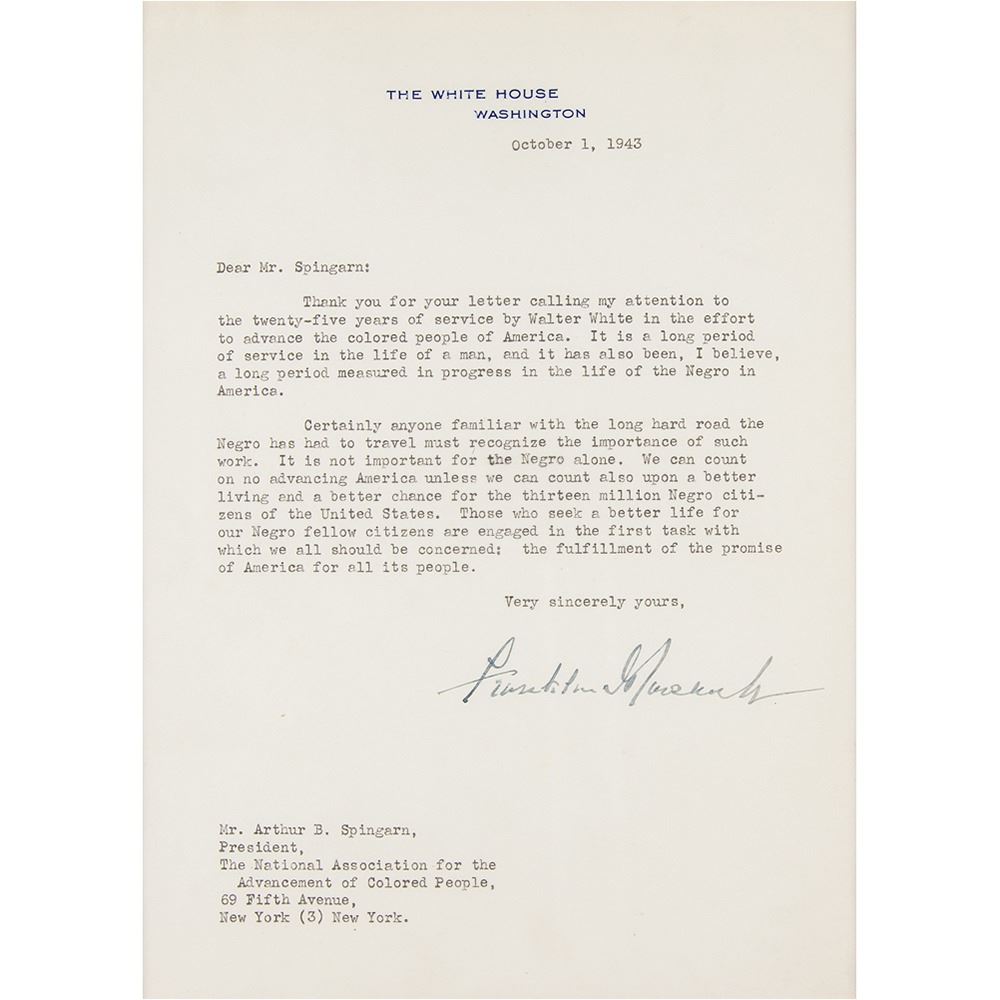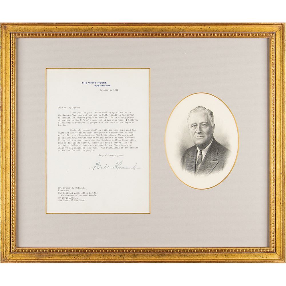 TLS as president, one page, 7 x 9.75, White House letterhead, October 1, 1943. Letter to Arthur B. Spingarn, president of the New York chapter of the National Association for the Advancement of Colored People (NAACP), in full: "Thank you for your letter calling my attention to the twenty-five years of service by Walter White in the effort to advance the colored people of America. It is a long period of service in the life of a man, and it has also been, I believe, a long period measured in progress in the life of the Negro in America. Certainly anyone familiar with the long hard road the Negro has had to travel must recognize the importance of such work. It is not important for the Negro alone. We can count on no advancing America unless we can count also upon a better living and a better chance for the thirteen million Negro citizens of the United States. Those who seek a better life for our Negro fellow citizens are engaged in the first task with which we all should be concerned: the fulfillment of the promise of America for all its people." Handsomely matted and framed with an engraved portrait of FDR to an overall size of 19.25 x 16.25. In fine condition.