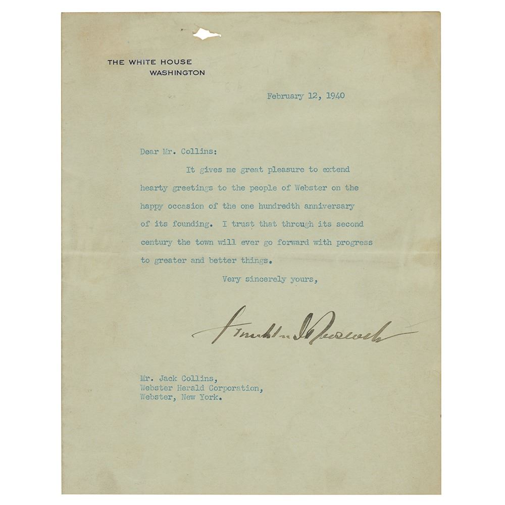 TLS as president, one page, 7 x 8.75, White House letterhead, February 12, 1940. Letter to Jack Collins of the Webster Herald Corporation, in full: "It gives me great pleasure to extend hearty greetings to the people of Webster on the happy occasion of the one hundredth anniversary of its founding. I trust that through its second century the town will ever go forward with progress to greater and better things." In very good to fine condition, with light creasing and soiling, and a small area of staple-related loss to the top.