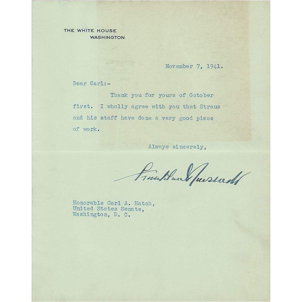 World War II-dated TLS from President Franklin D. Roosevelt, one page, 7 x 8.75, White House letterhead, November 7, 1941. Letter to New Mexico Senator Carl Hatch, in full: “Thank you for yours of October first. I wholly agree with you that Straus and his staff have done a very good piece of work.” In very good to fine condition, with a light block of toning, and an old newspaper clipping affixed to the back of the blank integral leaf.