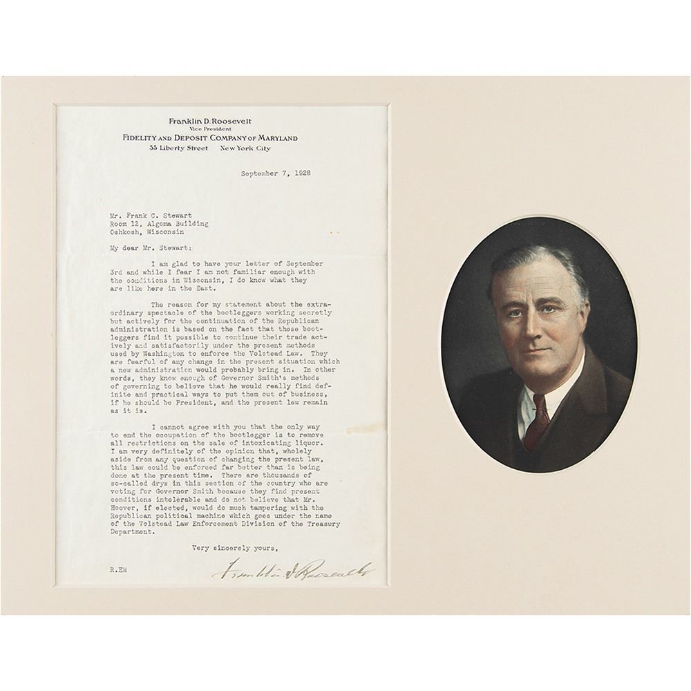 I cannot agree with you that the only way to end the occupation of the bootlegger is to remove all restrictions on the sale of intoxicating liquor. I am very definitely of the opinion that, wholly aside from any question of changing the present law, this law could be enforced far better than is being done at the present time. There are thousands of so-called drys in this section of the country who are voting for Governor Smith because they find present conditions intolerable and do not believe that Mr. Hoover, if elected, would do much tampering with the Republican political machine which goes under the name of the Volstead Law Enforcement Division of the Treasury Department.†Matted with a portrait of Roosevelt to an overall size of 14 x 11. In fine condition.