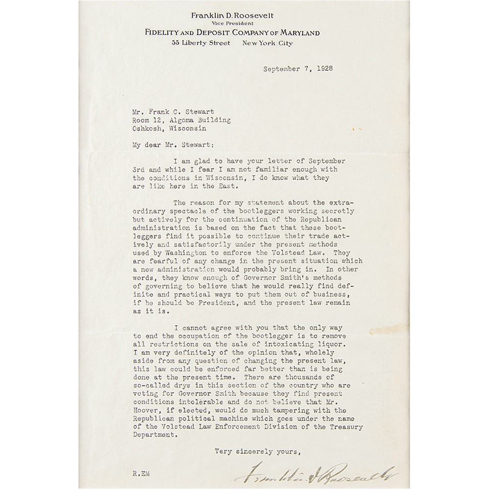 TLS, one page, 6.75 x 9.75, personal Fidelity and Deposit Company of Maryland letterhead, September 7, 1928. Letter to Frank C. Stewart on the status of prohibition and the proliferation of bootleggers, in part: “The reason for my statement about the extraordinary spectacle of the bootleggers working secretly but actively for the continuation of the Republican administration is based on the fact that these bootleggers find it possible to continue their trade actively and satisfactorily under the present methods used by Washington to enforce the Volstead Law. They are fearful of any change in the present situation which a new administration would probably bring in. In other words, they know enough of Governor Smith’s methods of governing to believe that he would really find definite and practical ways to put them out of business, if he should be President, and the present law remains as it is.