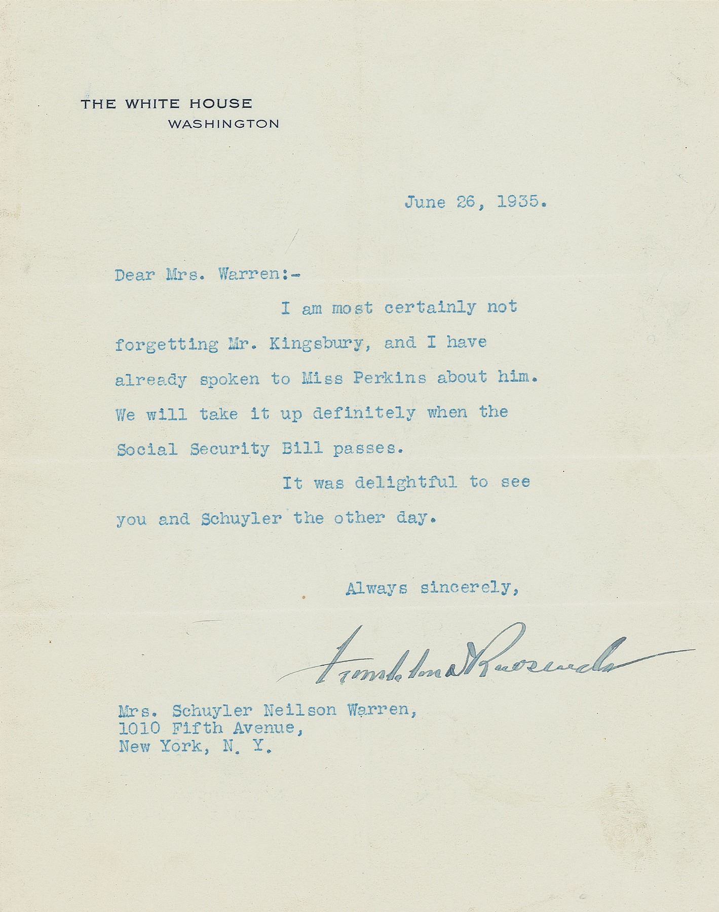 TLS as president, one page, 7 x 8.75, White House letterhead, June 26, 1935. Letter to Mrs. Schuyler Nelson Warren, in full: "I am most certainly not forgetting Mr. Kingsbury, and I have already spoken to Miss Perkins about him. We will take it up definitely when the Social Security Bill passes. It was delightful to see you and Schuyler the other day." In very good to fine condition, with intersecting folds and some light creasing.