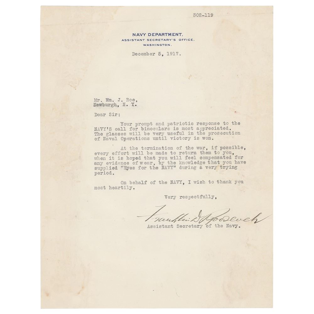 World War I-dated TLS, one page, 8 x 10.25, Navy Department, Assistant Secretary's Office letterhead, December 5, 1917. Letter to William J. Roe, in full: "Your prompt and patriotic response to the NAVY's call for binoculars is most appreciated. The glasses will be very useful in the prosecution of Naval Operations until victory is won. At the termination of the war, if possible, every effort will be made to return them to you, when it is hoped that you will feel compensated for any evidence of wear, by the knowledge that you have supplied 'Eyes for the NAVY' during a very trying period. On behalf of the NAVY, I wish to thank you most heartily." In very good to fine condition, with light staining and wrinkling from old mounting residue on the back.
