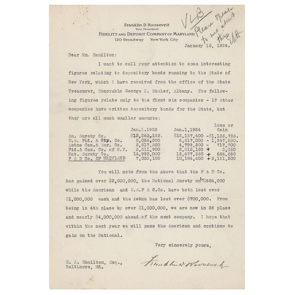 TLS, one page, 7.25 x 10.5, personal Fidelity and Deposit Company of Maryland letterhead, January 15, 1924. Letter to friend and business associate Colonel Edgar A. Hamilton, in part: "I want to call your attention to some interesting figures relating to depository bonds running to the State of New York, which I have received from the office of the State Treasurer, Honorable George K. Shuler, Albany. The following figures related only to the first six companies—17 other companies have written depository bonds for the State, but they are all much smaller amounts…You will note from the above that the F & D Co. has gained over $3,000,000, the National Surety only $684,000 while the American and U.S.F. & C. Co. have both lost over $1,000,000 each and the Aetna has lost over $700,000. From being in 4th place by over $1,000,000, we are now in 3rd place and nearly $4,000,000 ahead of the next company. I hope that within the next year we will pass the American and continue to gain on the National." In fine condition.