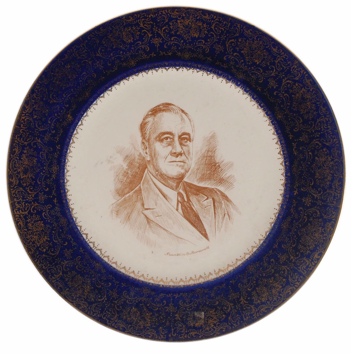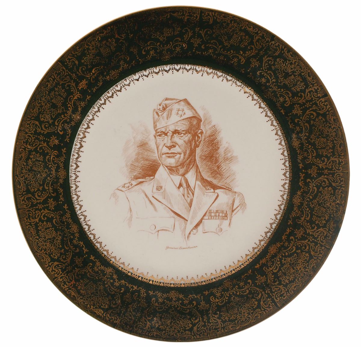 Handsome pair of picture plates marked Imperial by Salem China Company, both measuring 10.75? in diameter and decorated in the borders with 23K gold, one depicting President Franklin D. Roosevelt and the other depicting General Dwight D. Eisenhower. In overall fine condition.