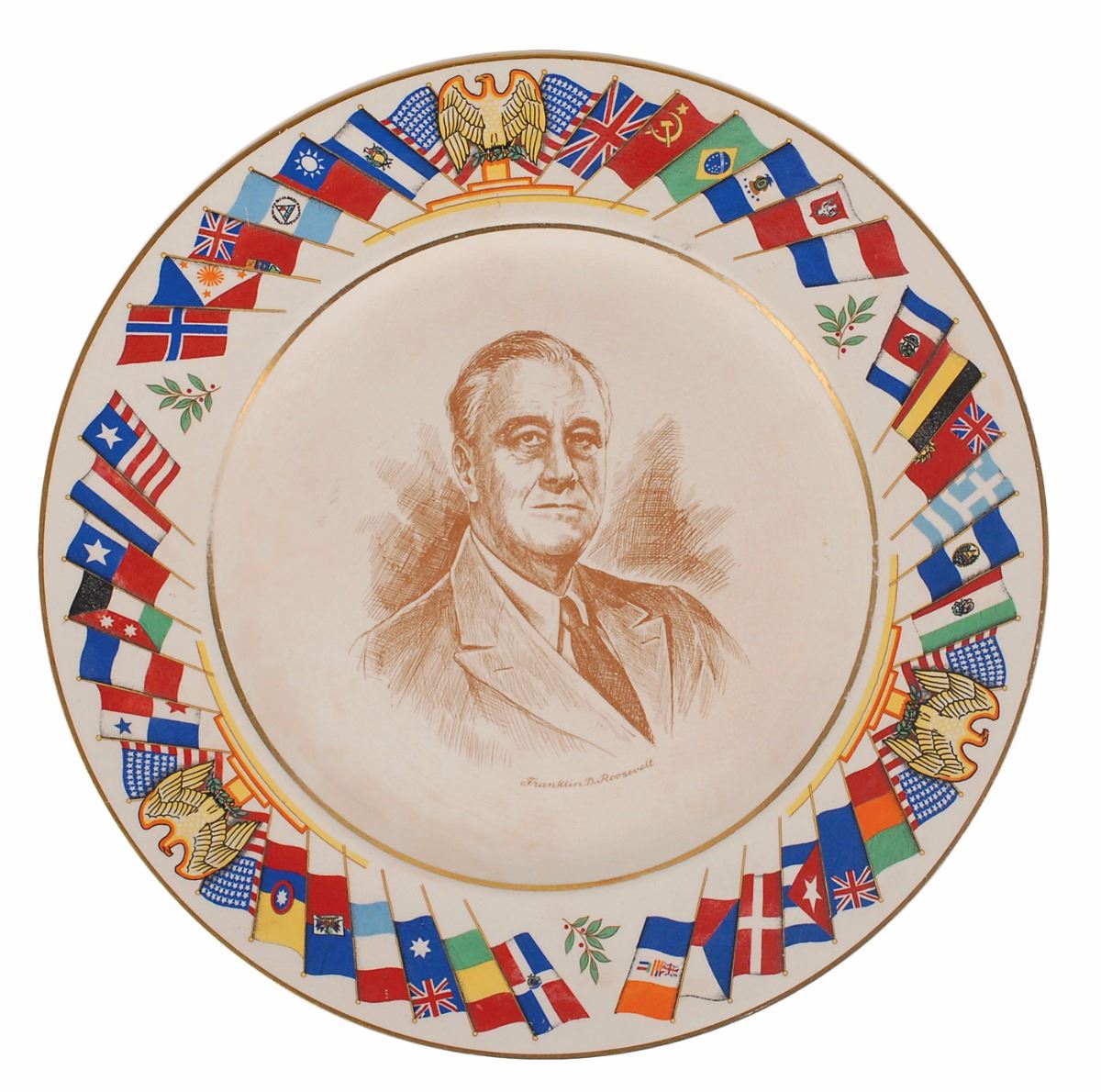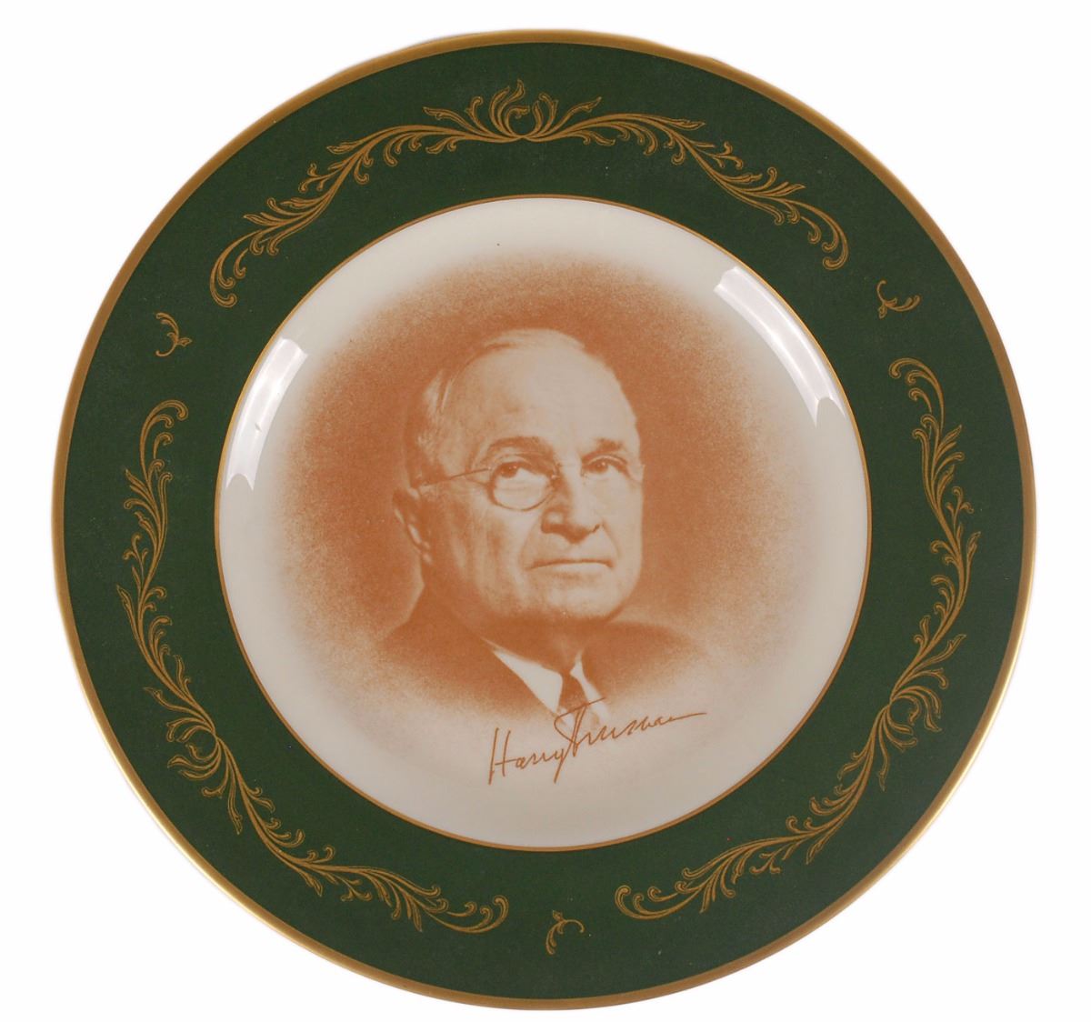 Two plates: a circa 1940s Allied Nations Commemorative Series plate produced by The Salem China Co., measuring 10.75? in diameter, depicting FDR in the center surrounded by flags around the rim; and a Pickard China plate produced in a limited edition of 3000, measuring 10.75? in diameter, depicting Truman with a facsimile signature below. In overall fine condition.