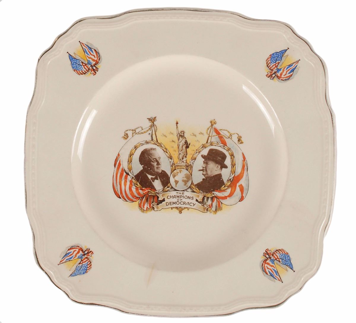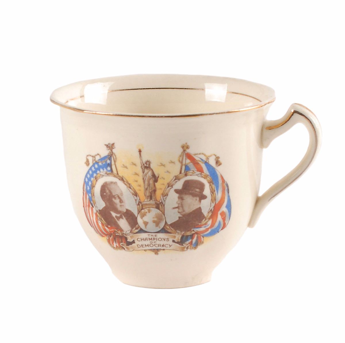 Handsome matching teacup and plate honoring Franklin D. Roosevelt and Winston Churchill as “The Champions of Democracy,” produced by Alfred Meakin of England. The teacup measures approximately 3.25? in diameter and 2.75? tall, and the rounded square-shaped plate measures approximately 8.5 x 8.5. A few marks and scratches to the plate, otherwise overall fine condition.