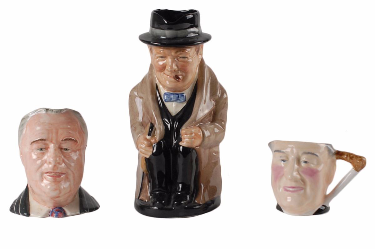 Three ceramic figural pitchers of British manufacture: one in the shape of Franklin D. Roosevelt, approximately 3.75? in diameter and 4.5? tall, marked on the bottom by Royal Winton; one small bone china pitcher in the shape of FDR, measuring approximately 2.5? in diameter and 3? tall, marked on the bottom by Thorley; and one in the shape of Winston Churchill, measuring approximately 3.5? in diameter and 8.5? tall, marked on the bottom by Royal Doulton. In overall fine condition.