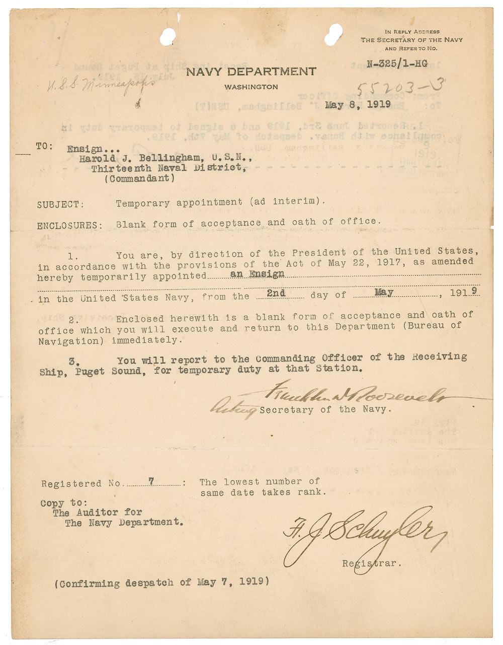 DS, one page, 8 x 10, May 8, 1919. Roosevelt, as acting Secretary of the Navy, temporarily appoints Harold J. Bellingham an ensign in the Navy, and ordering him to report for duty on the Puget Sound. In very good condition, with scattered toning, punch holes to top edge, several pencil notations, and a paperclip impression to top edge. Roosevelt served as Acting Secretary of the Navy from 1913-1920, where he developed a life-long affection for the Navy. Less than a year later, FDR would become the vice-presidential nominee in his first foray into national politics.