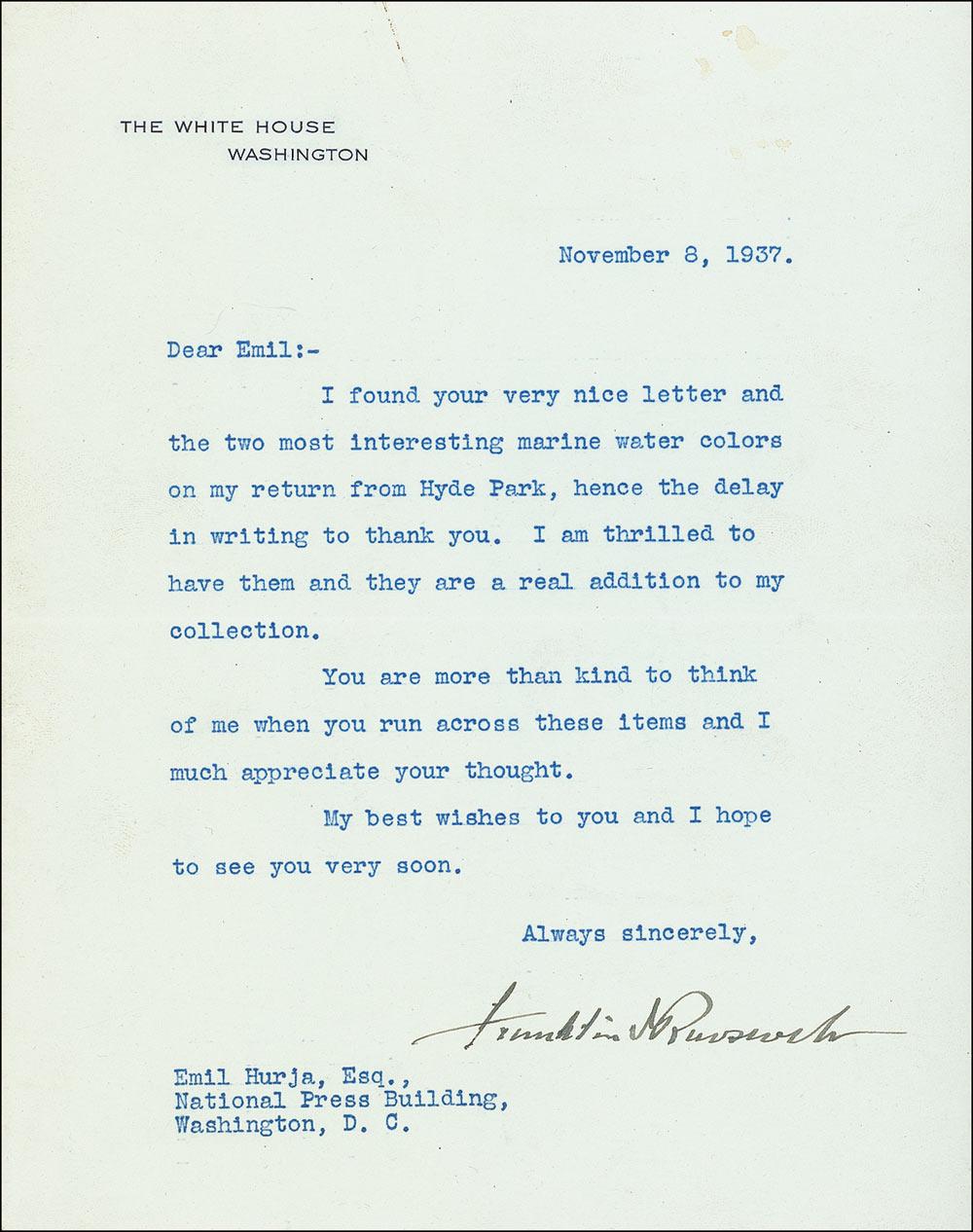TLS as president, one page, 7 x 9, White House letterhead, November 8, 1937. Letter of thanks to Emil Hurja. In part: “I found your nice letter and the two most interesting marine water colors on my return from Hyde Park, hence the delay in writing to thank you. I am thrilled to have them and they are a real addition to my collection.” In fine condition, with a bit of scattered light toning and soiling, and a rusty paperclip mark to top edge. Accompanied by the original mailing envelope. Hurja was a pioneer of political opinion polling, and an important person during Roosevelt's presidency in respect to social and economic reforms.