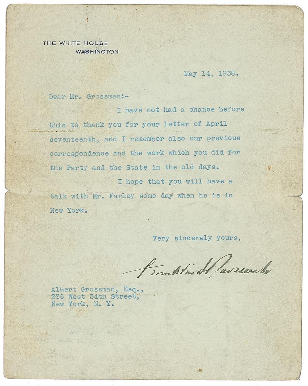 TLS as president, one page, 7 x 9, White House letterhead, May 14, 1938. Letter to Albert Grossman. In full: “I have not had a chance before this to thank you for your letter of April seventeenth, and I remember also our previous correspondence and the work which you did for the Party and the State in the old days. I hope that you will talk with Mr. Farley some day when he is in New York.” Small separations along central horizontal fold, scattered toning and soiling, and rusty paperclip marks to top edge, otherwise very good condition.