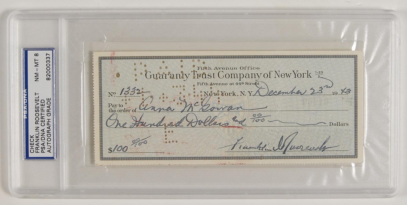 Bank check, 6.5 x 2.5, filled out in another hand and signed by Roosevelt, as president, payable to Anna McGowan for $100.00, December 23, 1943. Encapsulated in a plastic PSA/DNA authentication holder, grading the autograph “NM-MT 8.” Cancellation holes to body, show-through from stamps on reverse, and some mild toning, otherwise fine condition.