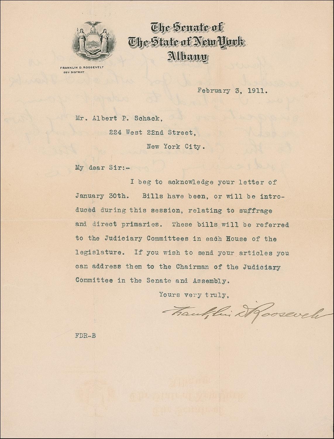 TLS, one page, 8 x 10.5, Senate of the State of New York letterhead, February 3, 1911. Letter to Albert Schack. In full: “I beg to acknowledge your letter of January 30th. Bills have been, or will be introduced during this session, relating to suffrage and direct primaries. These bills will be referred to the Judiciary Committee in each House of the legislature. If you wish to send your articles you can address them to the Chairman of the Judiciary Committee in the Senate and Assembly.” Intersecting folds, one through a single letter of signature, a uniform shade of mild toning, scattered light edge creases, and offset of the letterhead in the blank bottom area from folding, otherwise fine condition.