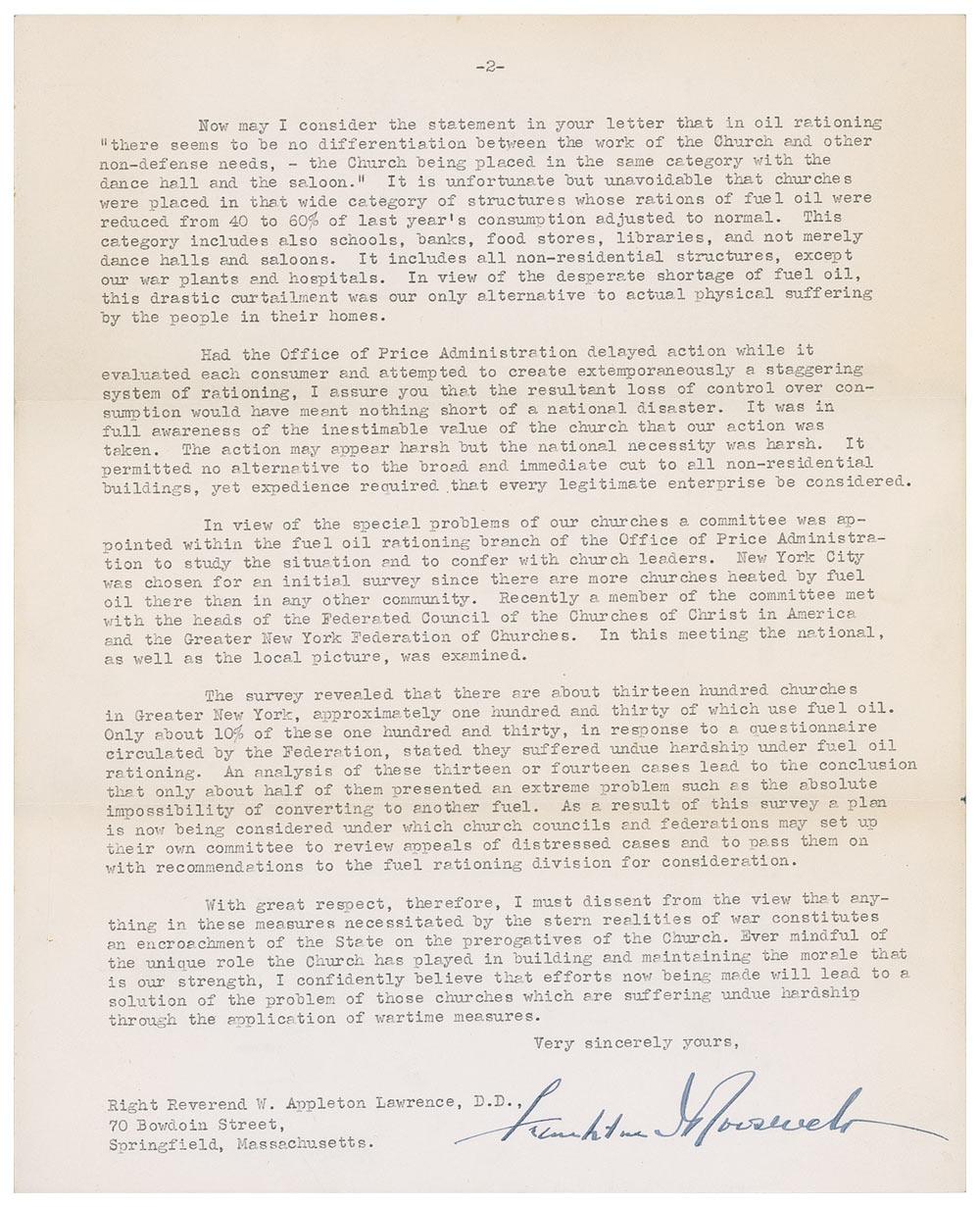 Lengthy war-dated TLS as president, two pages, 8 x 10.5, White House letterhead, March 13, 1943. FDR writes to the Right Reverend W. Appleton Lawrence in Springfield, Massachusetts. In part: “I must appeal to your forbearance for my seemingly long delay in answering your letter of January fourteenth, received, as you know, during my absence in North Africa. I feel, also, that you will give charitable consideration to the extraordinary pressure under which I am working these days and to other circumstances which have militated against an earlier reply.