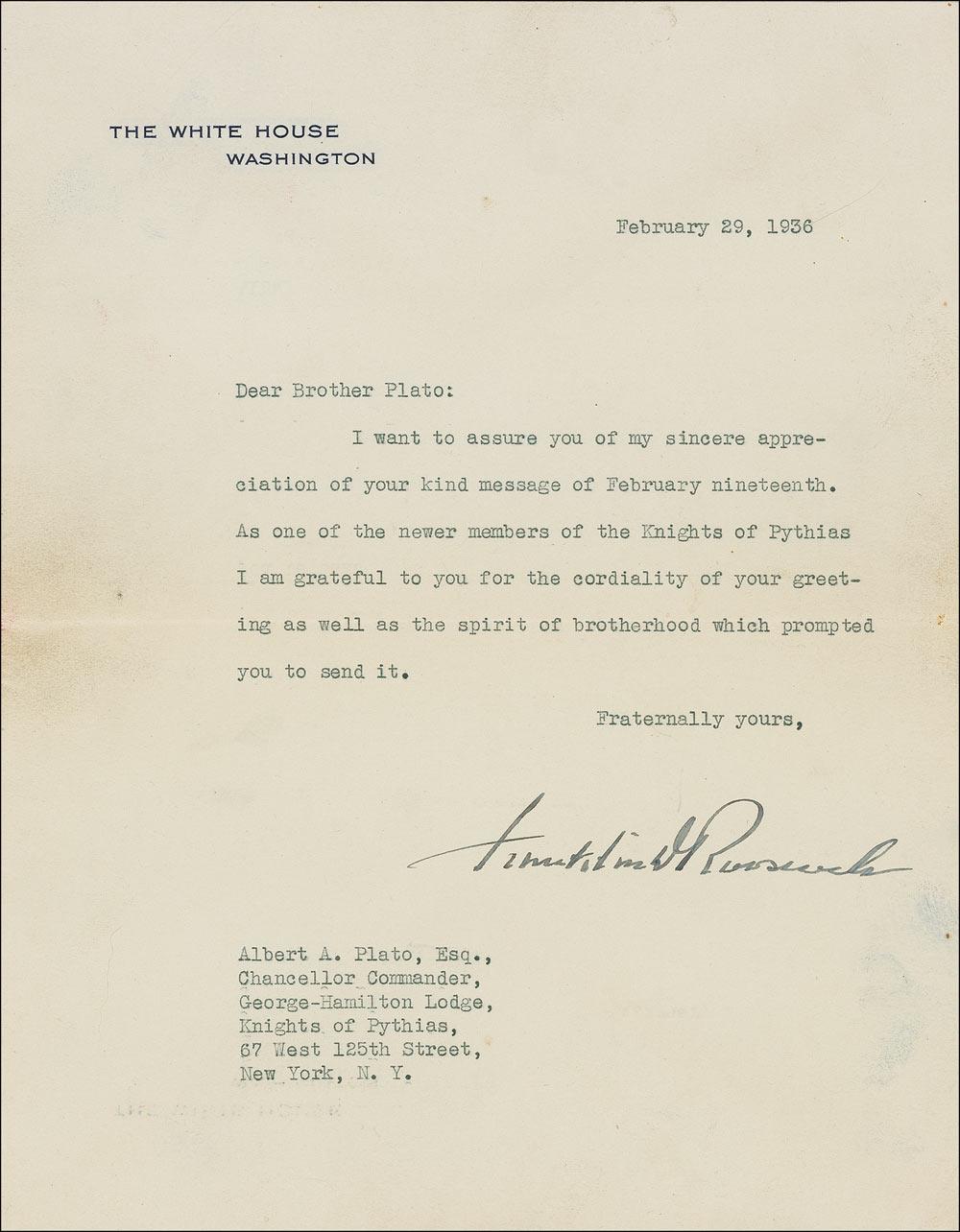 TLS as president, one page, 7 x 9, White House letterhead, February 29, 1936. Letter to Albert A. Plato, the Chancellor Commander of the Knights of Pythias. In full: “I want to assure you of my sincere appreciation of your kind message of February nineteenth. As one of the newer members of the Knights of Pythias I am grateful for the cordiality of your greeting as well as the spirit of brotherhood which prompted you to send it.” Scattered toning and soiling, light mirroring of letterhead along bottom edge, and a couple fingerprints under signature, otherwise fine condition. Accompanied by the original mailing envelope, with several pencil notations and cross-outs.