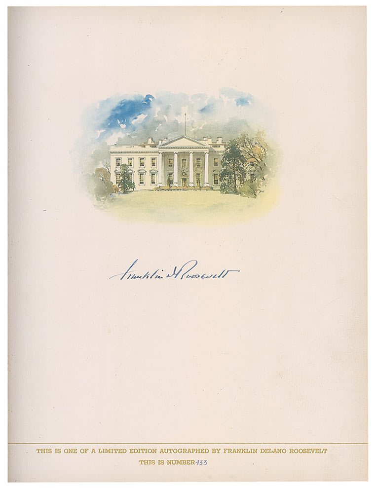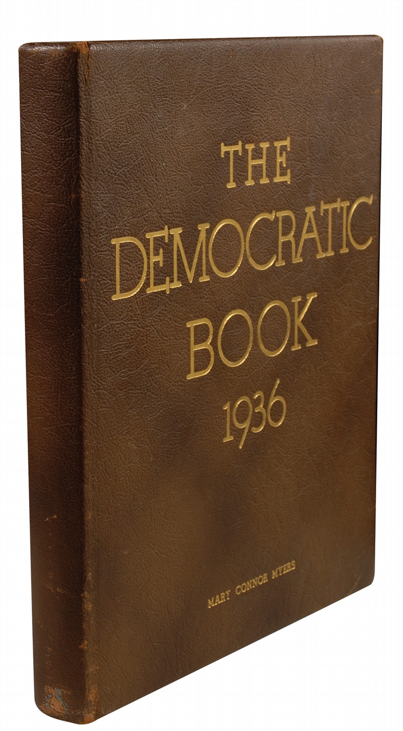Signed book: The Democratic Book: 1936. Gilt-stamped leather (including “Mary Connor Myers,” the original owner), 11.5 x 14.5, 384 pages. Limited edition (limitation unspecified; this copy No. 433), signed by Roosevelt on the limitation page beneath a watercolor vignette of the White House. In fine condition, with some scuffs to the covers, scattered soiling, and a bottom portion of one of FDR’s portraits on an inside page torn out. The signed watercolor remains unaffected. A lavishly produced promotional ‘year book’ for the Democratic Party, the publication of The Democratic Book in the Spring of 1936 was assailed by Republicans as a violation of the Corrupt Practices Act which prohibits corporations from contributing to national campaigns.
