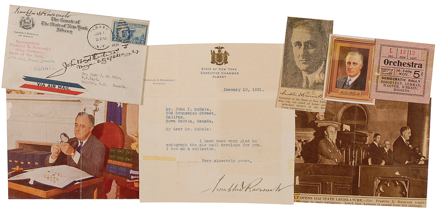 Two items: Senate of the State of New York air mail mailing envelope, 6 x 3.5, postmarked January 1, 1931, signed along the top in fountain pen by Roosevelt, and also signed by the Mayor of Albany, and a state senator; and a TLS, trimmed to a size of 6.25 x 6.75, to the envelope’s recipient, and reading, “I have been very glad to autograph the air mail envelope for you. I too am a collector.” In very good condition, with some scattered light toning and soiling to cover, and mailing folds, blocks of toning, and old tape to letter.