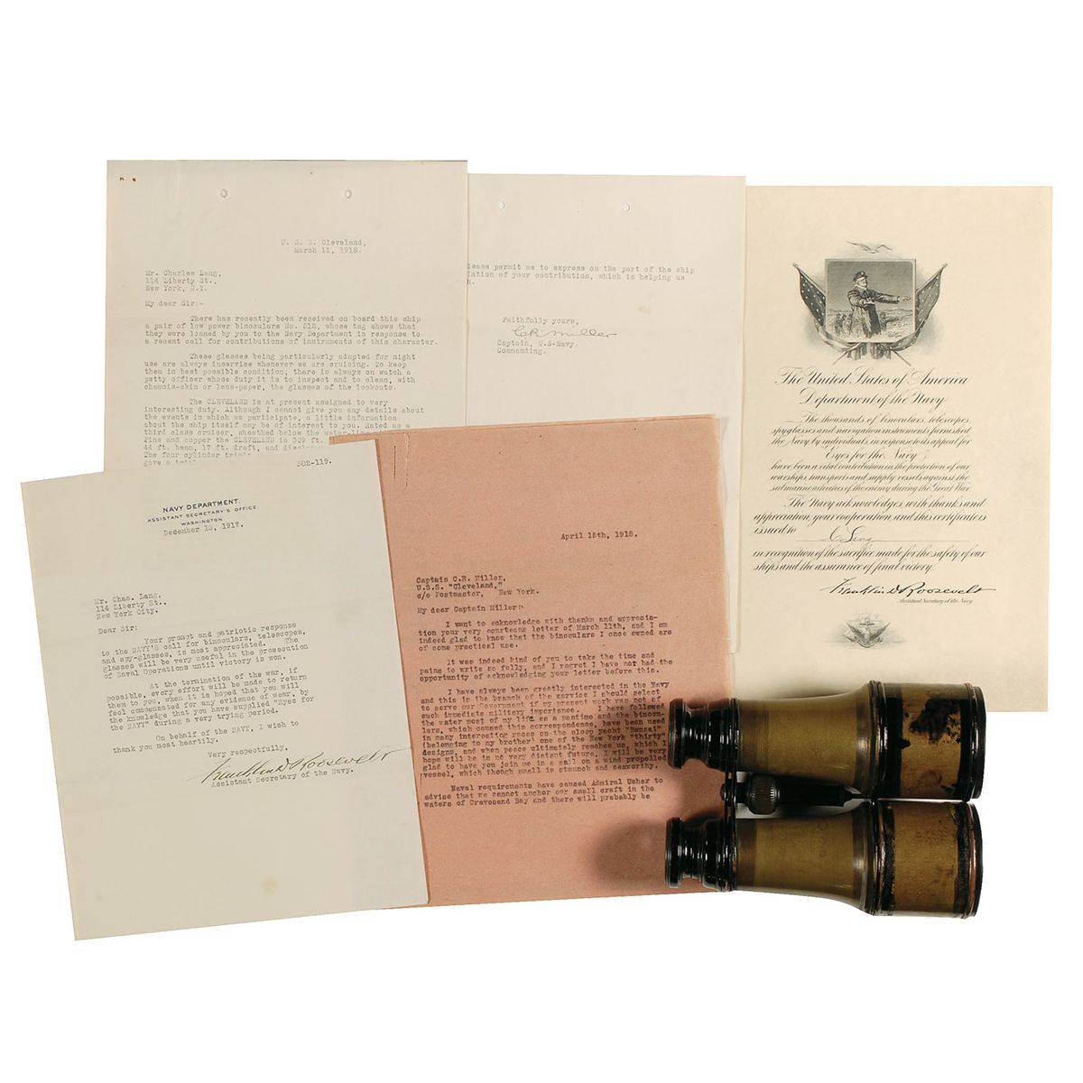 Also included are: Original newspaper article from The New York Times, November 24, 1917, 2.25 x 6.25, headlined "Navy Needs More 'Eyes'/Government Will Tag and Attempt/to Return All Borrowed Glasses." Accompanied by the retained 8.5 x 10.75 unsigned typed carbon on thin paper of the letter Lang sent to Roosevelt; an uncashed check from the Treasurer of the United States, payable for $1.00 to Charles Lang, Washington, D.C., January 25, 1918; a printed certificate, with a facsimile Roosevelt signature, created especially for the Navy's Eyes for the Navy appeal, "issued to C. Lang in recognition of the sacrifice made for the safety of our ships and the assurance of final victory"; a TLS signed, “C. R. Miller," Captain, U.S. Navy/Commanding, of the U.S.S. Cleveland, March 11, 1918. Thank you letter to Charles Lang reads, in part, "There has recently been received on board this ship a pair of low power binoculars No. 512, whose tag shows that they were loaned by you to the Navy Department in response to a recent call for contributions of instruments of this character. These glasses being particularly adapted for night use are always inservice whenever we are cruising…The CLEVELAND is at present assigned to very interesting duty. Although I cannot give you any details about the events in which we participate, a little information about the ship itself may be of interest to you”; a retained two-page unsigned typed carbon of the April 15, 1918 letter Lang sent to Miller, thanking him. In part, "The binoculars, which caused this correspondence, have been used in many interesting races on the sloop yacht 'Banzai' (belonging to my brother) one of the New York 'thirty' designs; and the pair of binoculars first used aboard the sloop yacht Banzai in yacht races and then on the cruiser Cleveland in World War I.” In fine overall condition. A unique opportunity to own binoculars, previously used in yacht races in New York harbor, then used by the Navy aboard a cruiser during World War I with provenance including a letter from FDR!