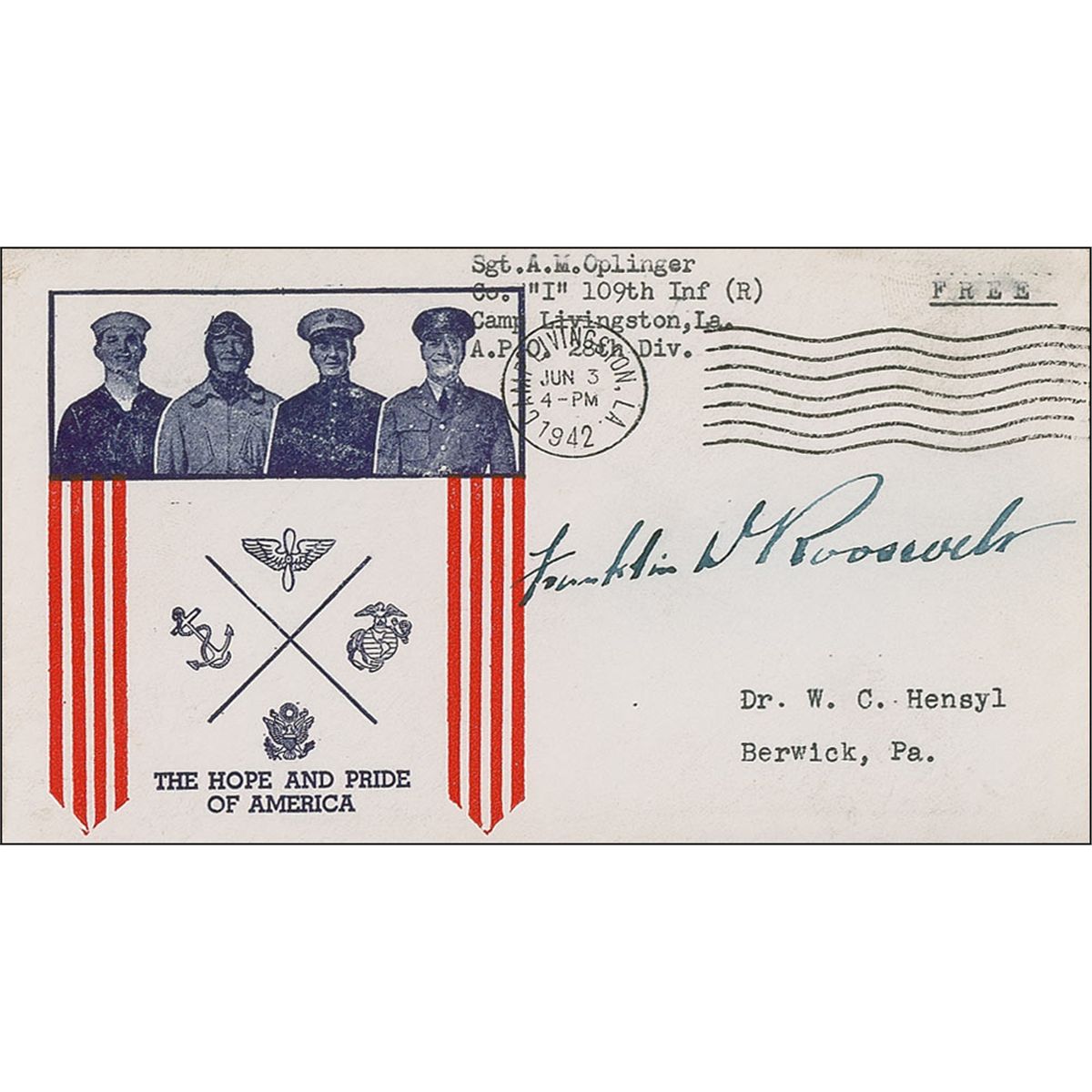 Commemorative cover with a cachet honoring the US Armed Forces, signed across the front in fountain pen, as president, “Franklin D. Roosevelt.” In fine condition, with typed return address at top, typed “Free” to upper right and a bit of light soiling.