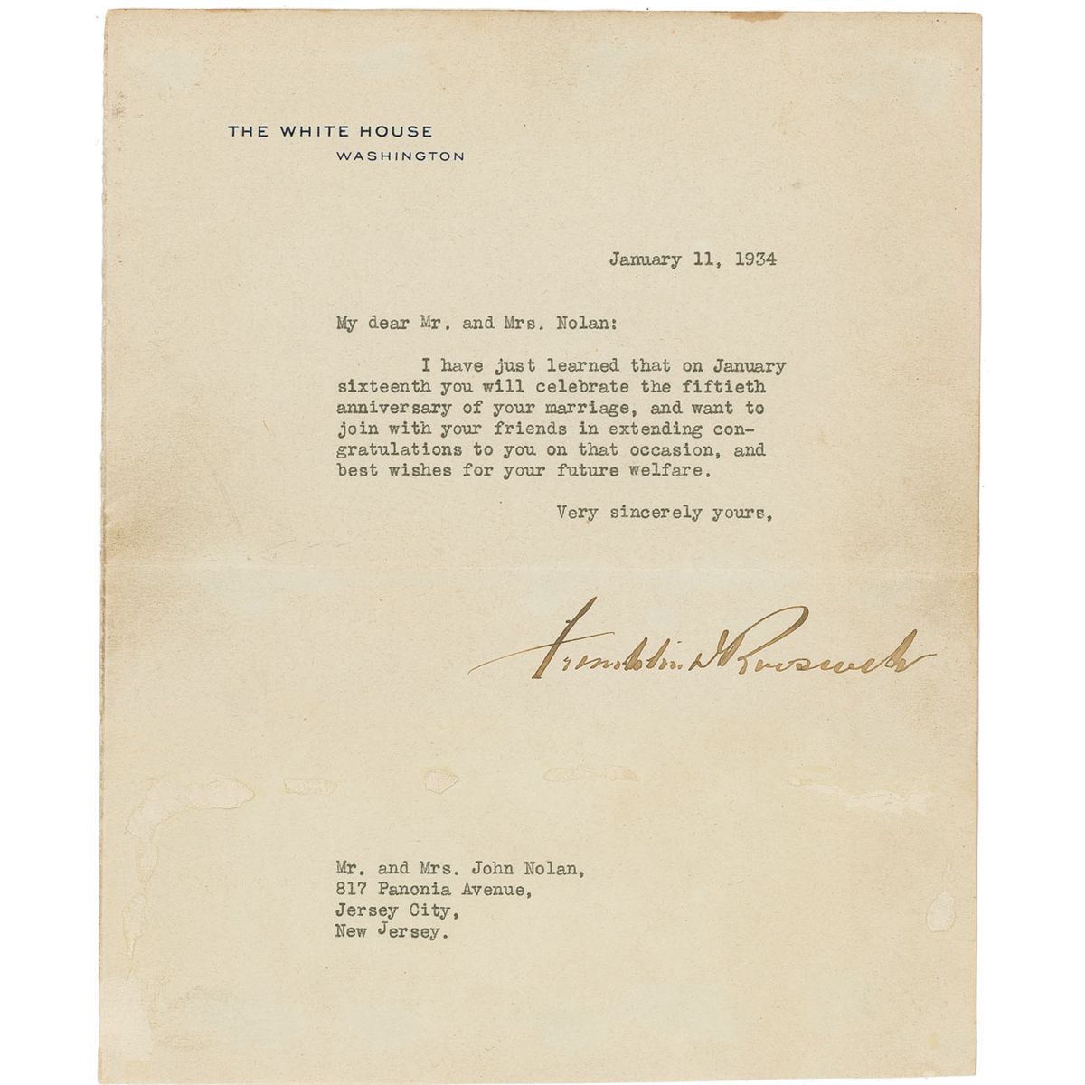 TLS as president, one page, 7 x 8.5, White House letterhead, January 11, 1934. Letter of congratulations reads, in part: “I have just learned that on January sixteenth you will celebrate the fiftieth anniversary of your marriage, and want to join with your friends in extending congratulations to you.” In very good condition, with scattered toning and soiling and paper remnants, mounting remnants to reverse, and loss to bottom portion. Accompanied by the original mailing envelope’s address panel.