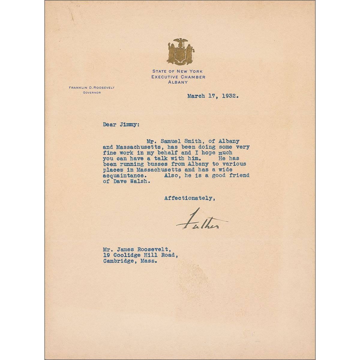 TLS signed “Father,” one page, 8 x 10.5, State of New York Executive Chamber letterhead, March 17, 1932. In a letter to his son James, FDR writes, in full: “Mr. Samuel Smith, of Albany and Massachusetts, has been doing some very fine work in my behalf and I hope much you can have a talk with him. He has been running busses from Albany to various places in Massachusetts and has a wide acquaintance. Also, he is a good friend of Dave Walsh.” Uniform toning, a few trivial spots of soiling, a faint paperclip impression and small tear at the top edge, otherwise fine condition. An uncommon and highly-desirable signature.
