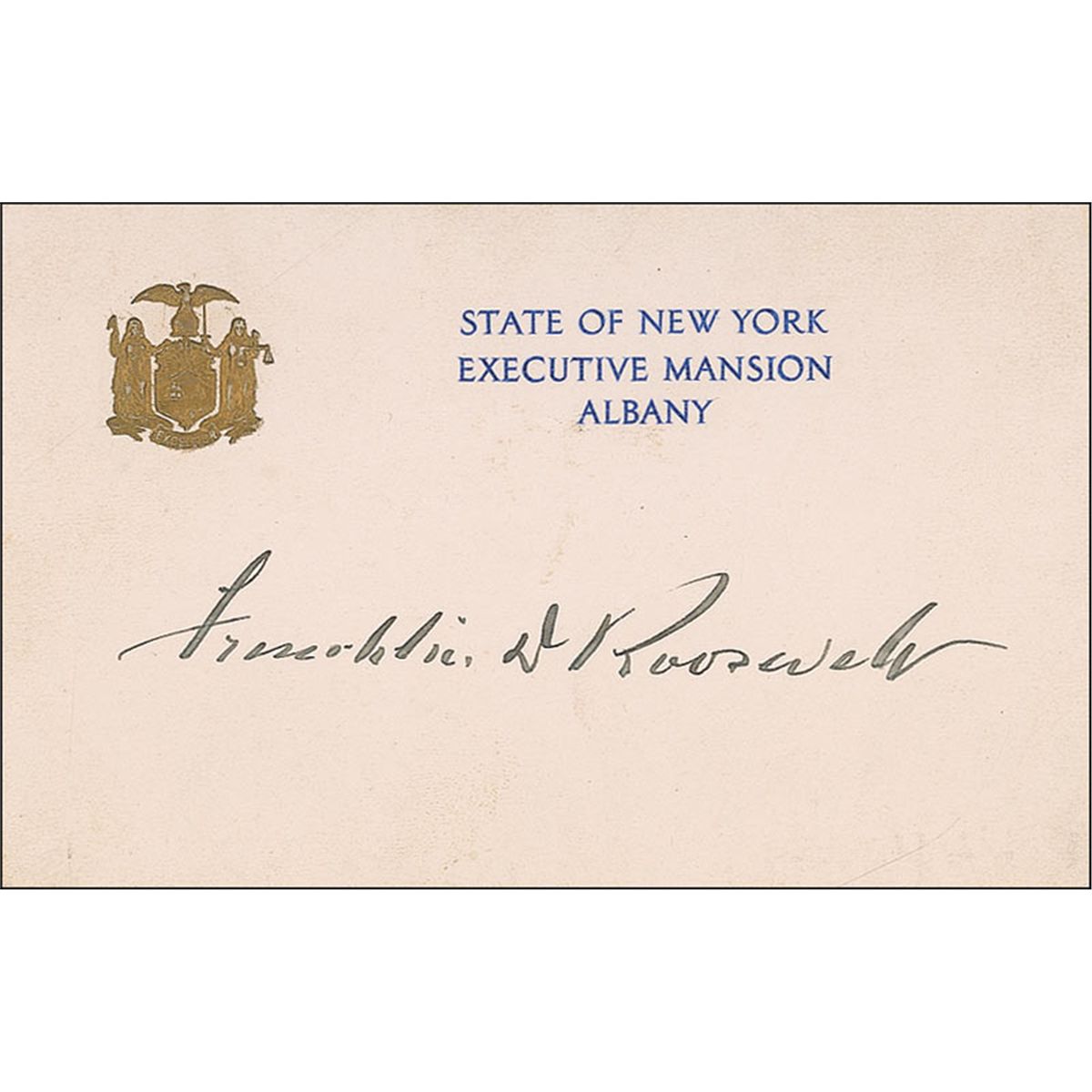 Vintage fountain pen signature, “Franklin D. Roosevelt,” on an off-white 5 x 3 embossed State of New York Executive Mansion card. In fine condition, with a bit of scattered mild soiling.